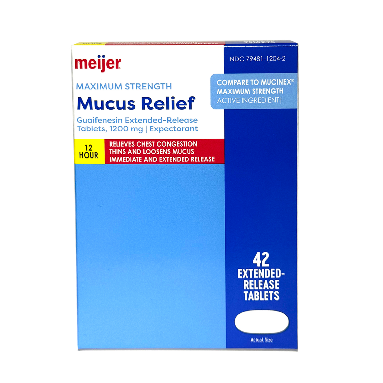Compare to Maximum Strength Mucinex active ingredient. Say goodbye to mucus with Meijer Chest Congestion and Mucus Relief ER Max, Guaifenesin, 1200 mg. This powerful expectorant works for up to 12 hou…