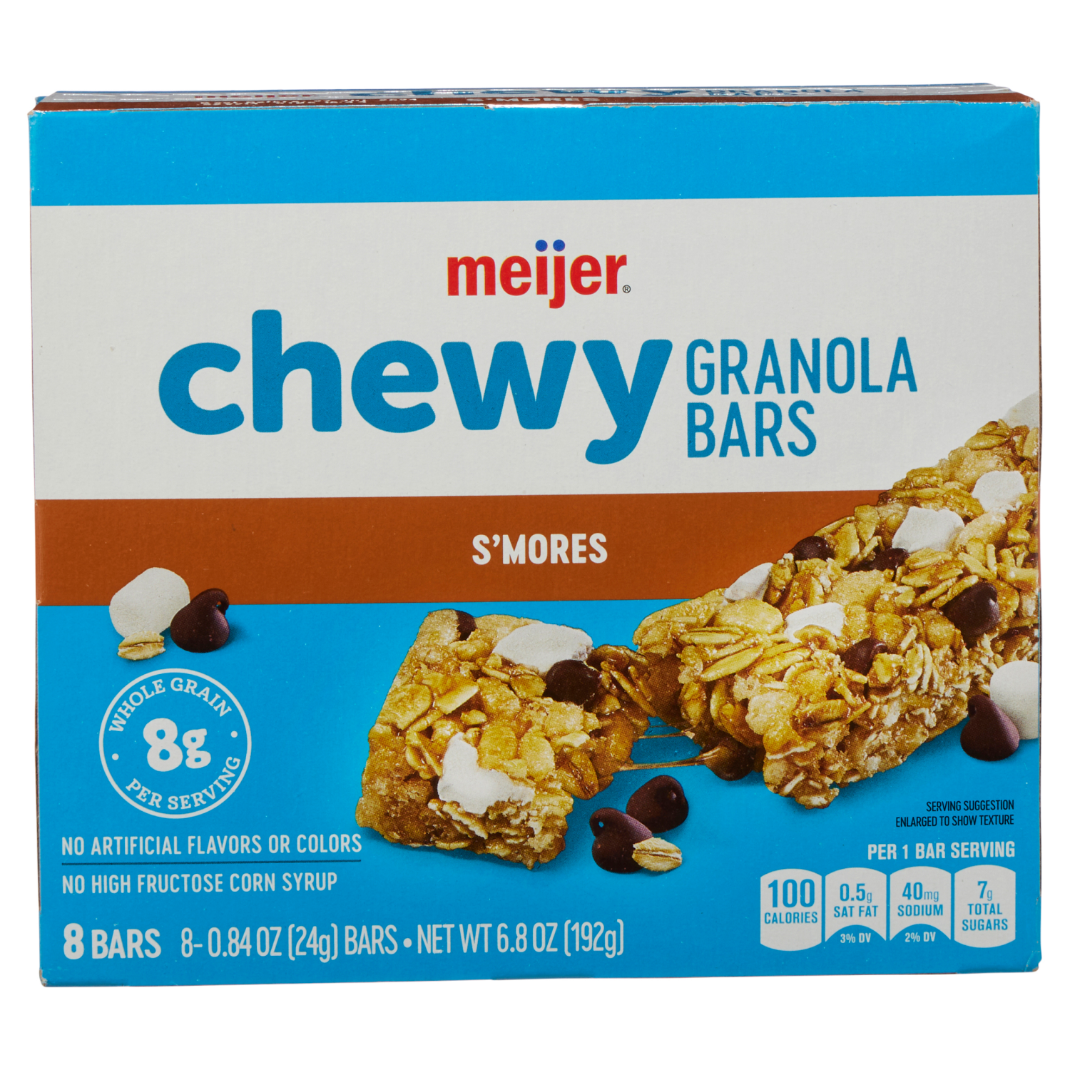 A chewy granola bar made with a mixture of granola, brown rice crisps, chocolate chips, and marshmallows mixed with a sweet syrup containing molasses and other ingredients.