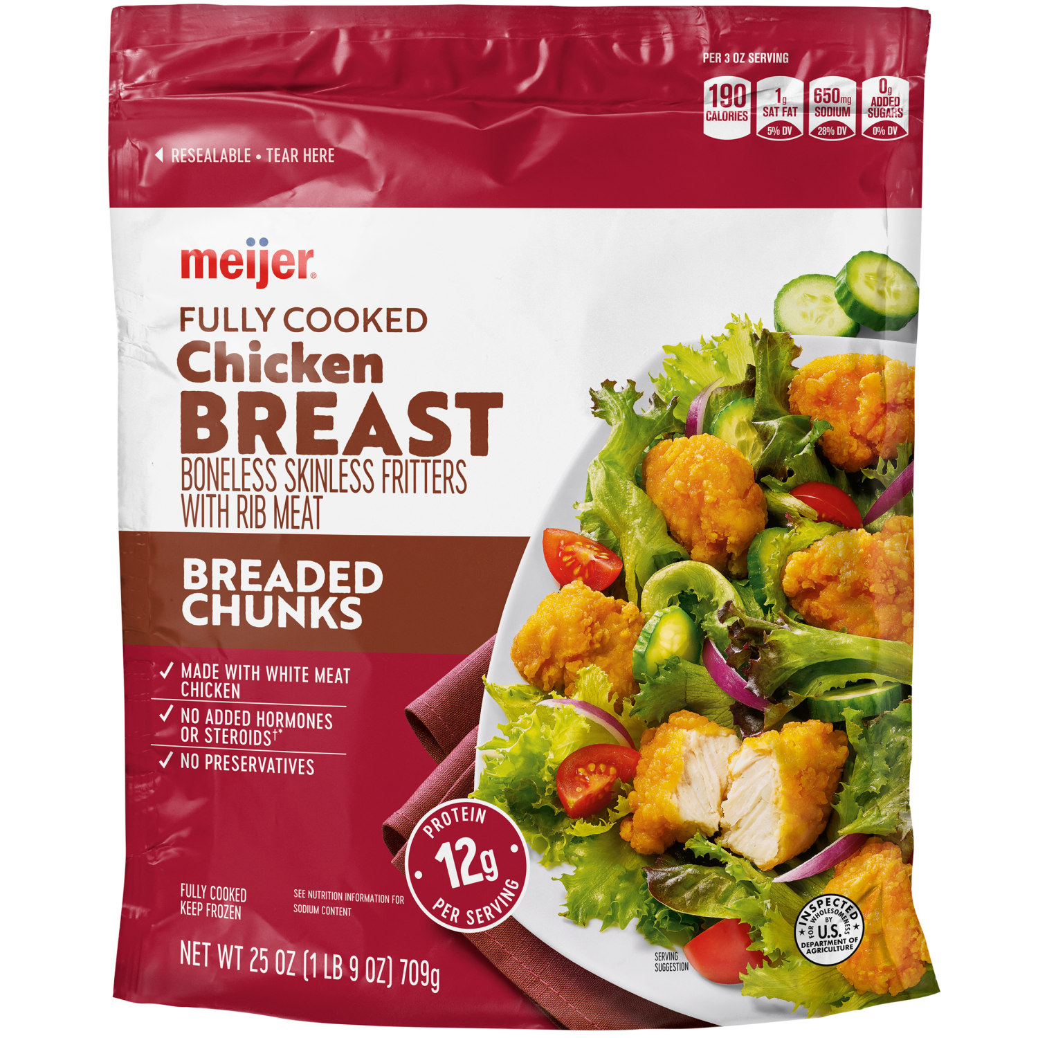 Boneless, skinless chicken breasts with rib meat, wheat flour, water, bleached wheat flour, Contains 2% or less of the following: dextrose, extractives of paprika and annatto, modified corn starch, sa…