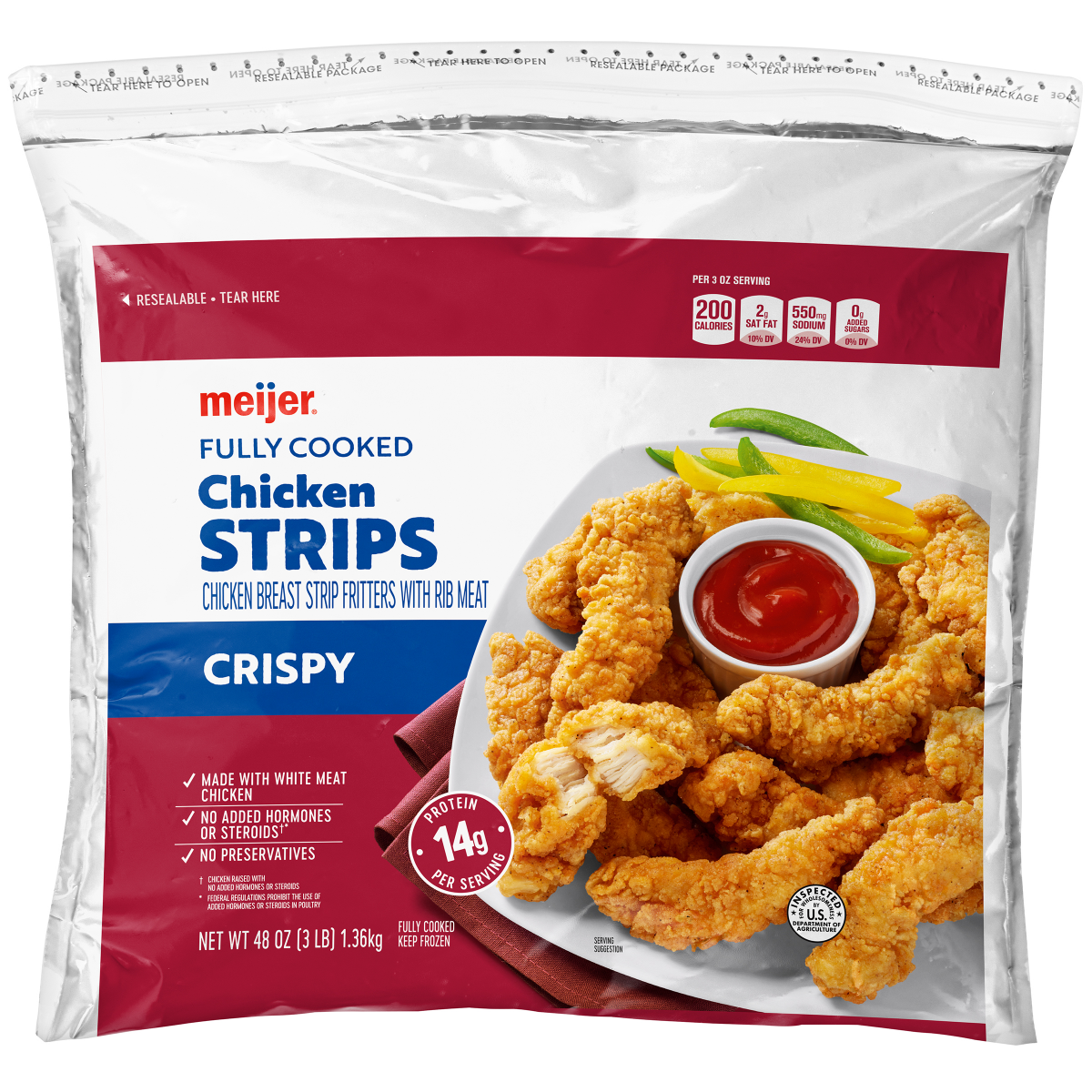 Meijer Crispy Chicken Strips are fully cooked chicken breast strip fritters with rib meat. They are free from added hormones, steroids, and preservatives and offer a quality meal option for your famil…