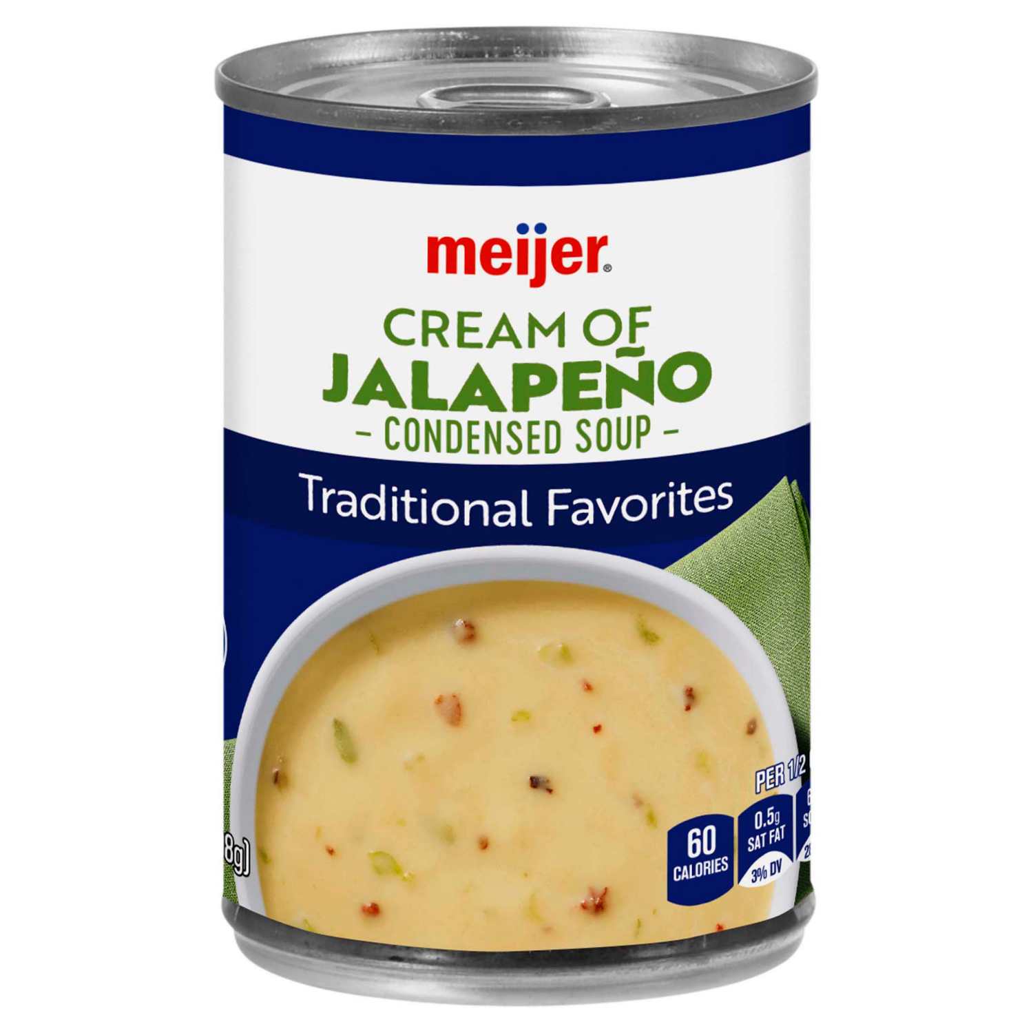 Meijer cream of jalapeno soup is a great addition to your dishes. Not only does it contain jalapeno peppers - it also contains green bell peppers & green chiles!