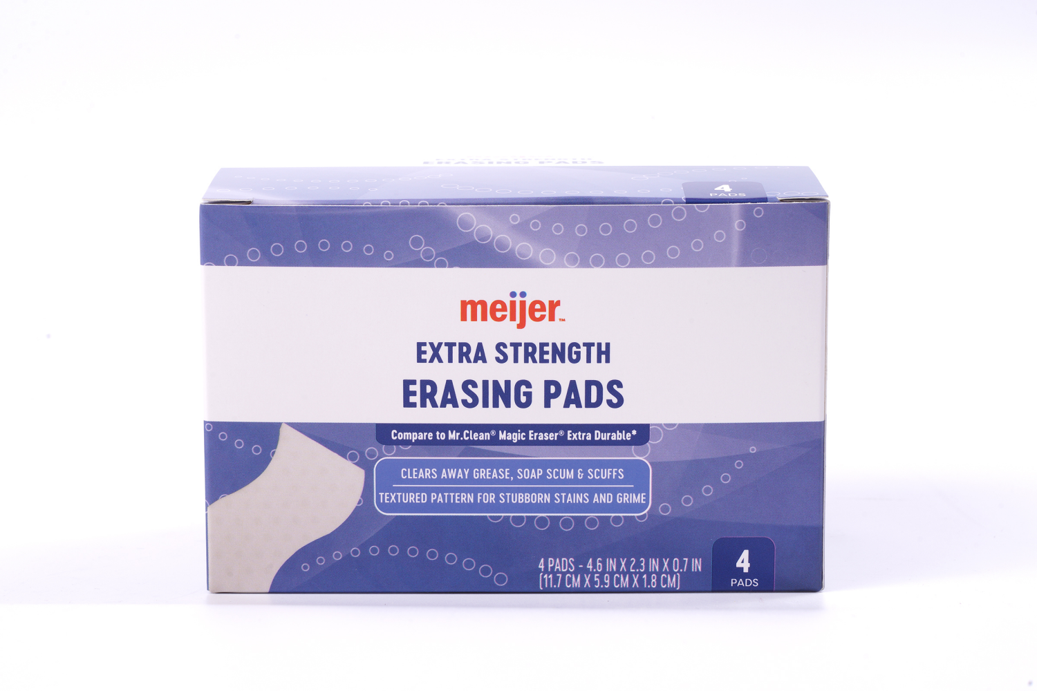 These Meijer extra strength erasing pads are constructed of a unique material that lifts tough dirt and grime away from surfaces. With just water, this erasing pad wipes crayon marks and scuff marks f…
