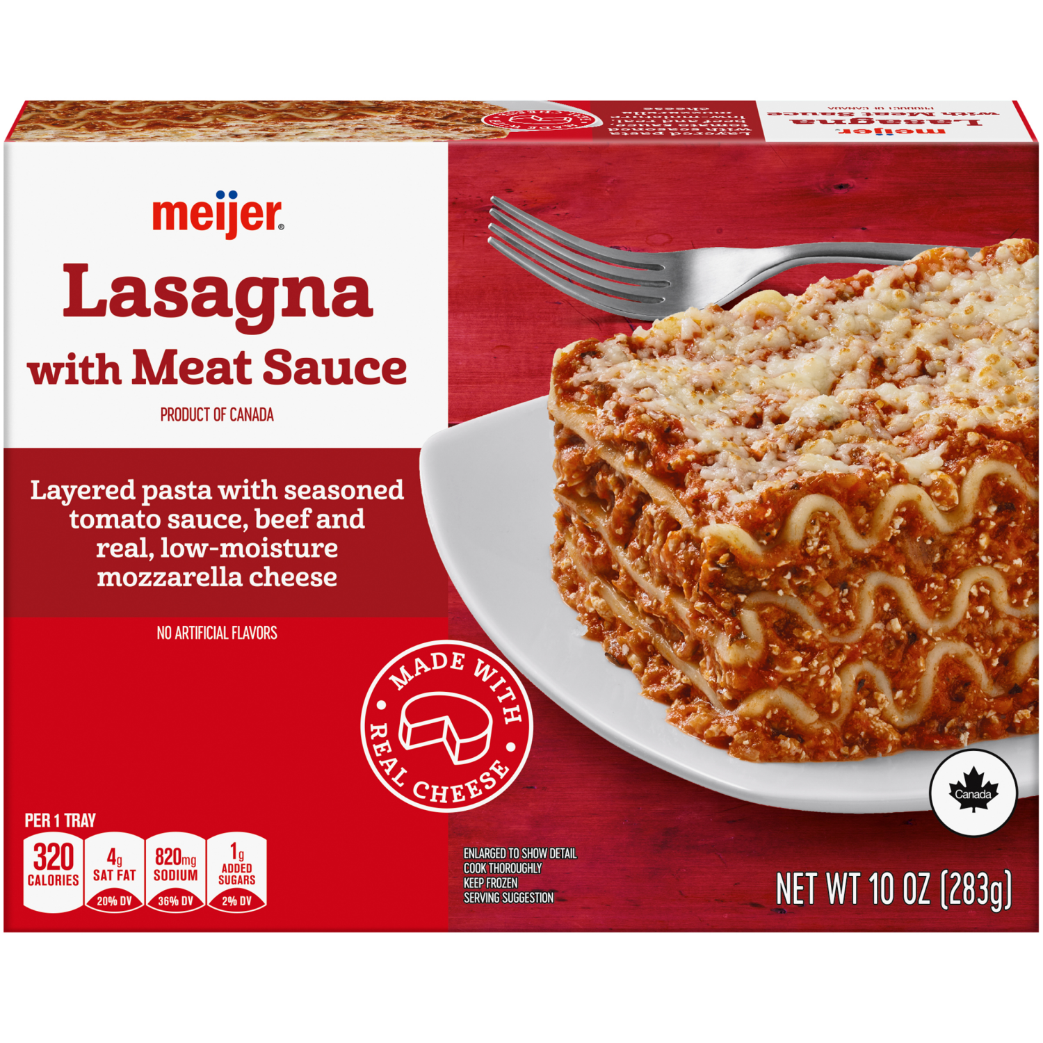 Meijer Frozen Lasagna with Meat Sauce is a delightful meal that's ready in minutes. It features layered pasta with a seasoned tomato sauce, beef, and real, low-moisture mozzarella cheese. This delicio…