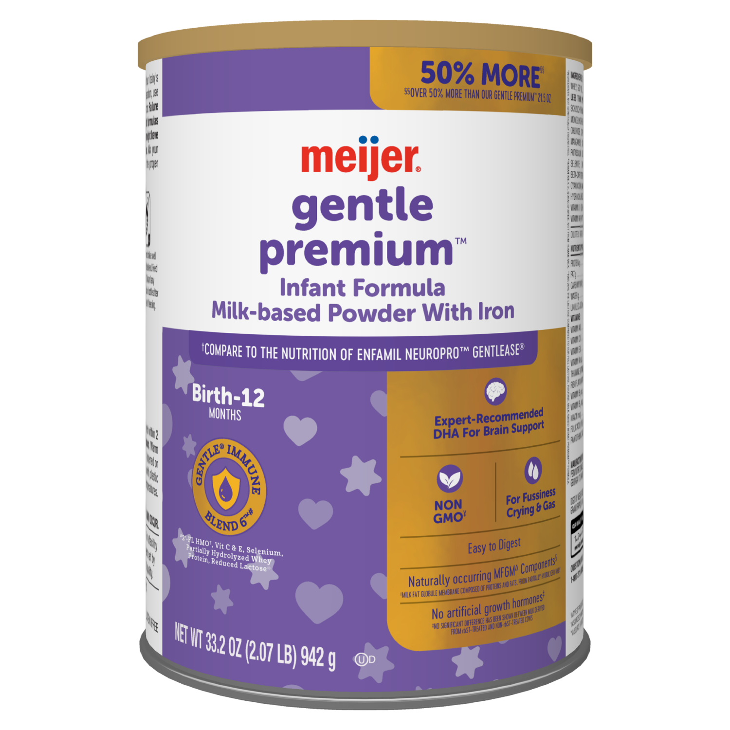 Compare to Enfamil Gentlease. Meijer Gentle Baby Formula has partially broken down protein for babies prone to fussiness, gas and crying. Complete nutrition for 012 months. DHA, choline help support b…