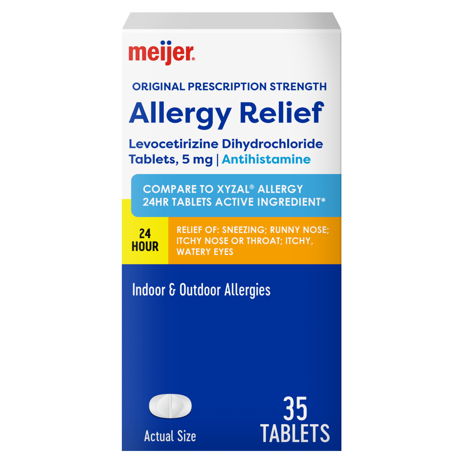 Compare to the active ingredient in XYZAL Allergy 24HR. Find 24 hour relief of allergy symptoms with Meijer Levocetirizine Dihydrochloride Tablets, 5 mg, Antihistamine, All Day Allergy Relief. This al…