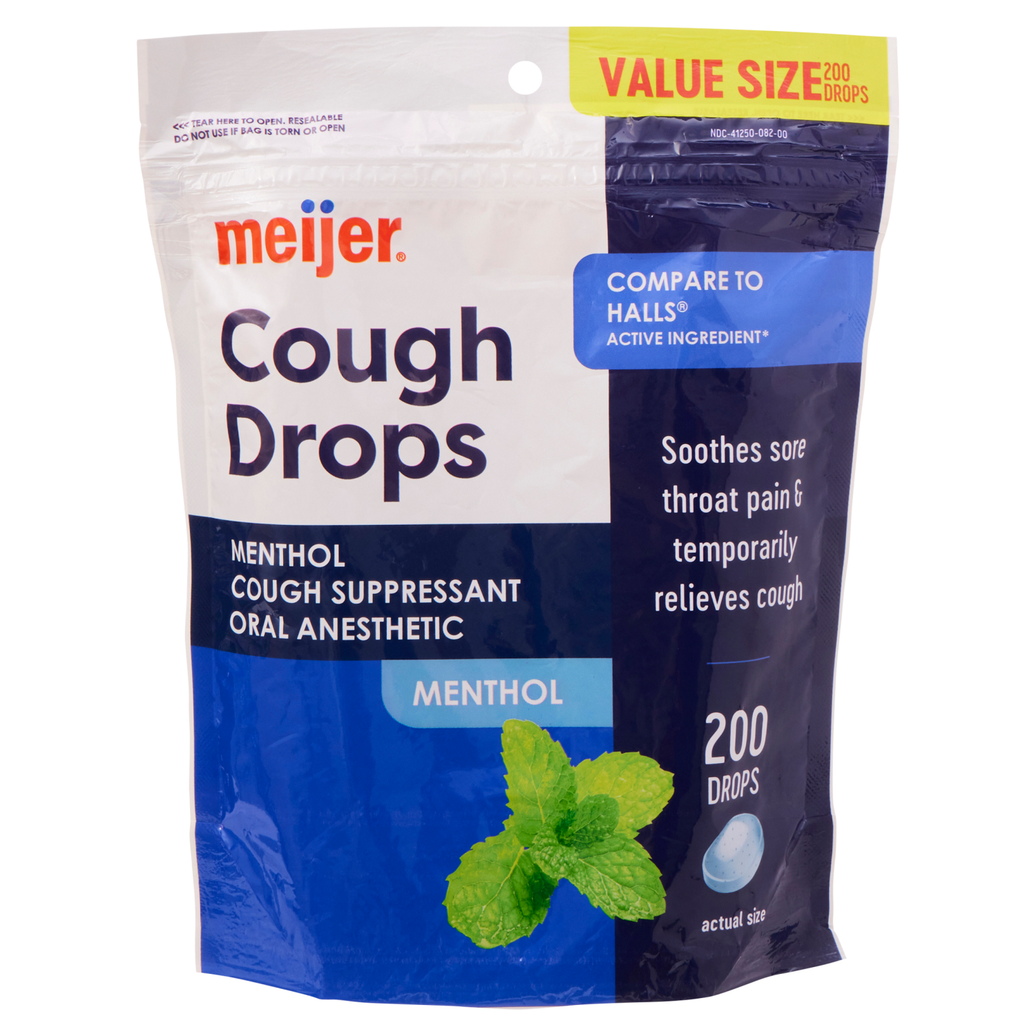 Meijer Menthol Cough Drops soothes sore throat pain.