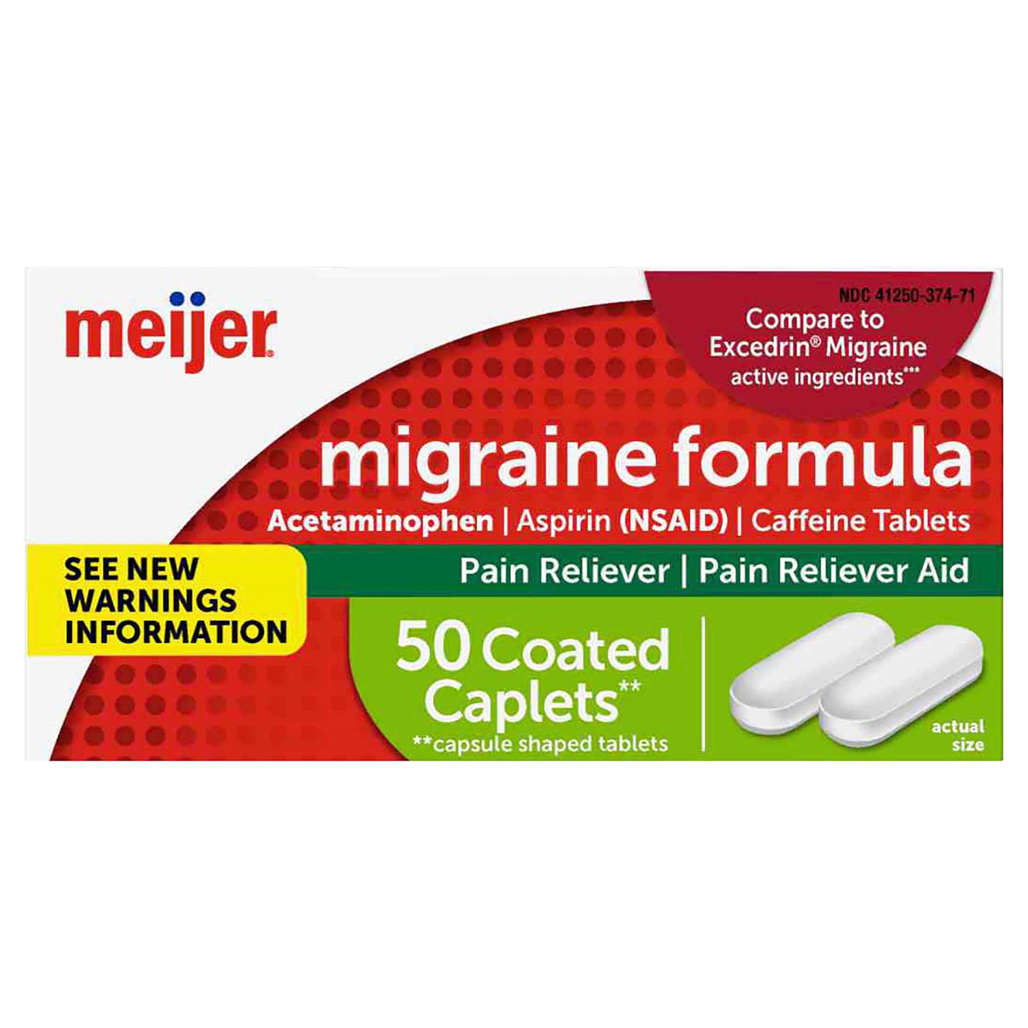 Compare to the active ingredients in Excedrin Migraine. Meijer Migraine Relief Caplets contains acetaminophen, aspirin (NSAID) and caffeine to help with migraine relief. Meijer Migraine Relief Caplet…