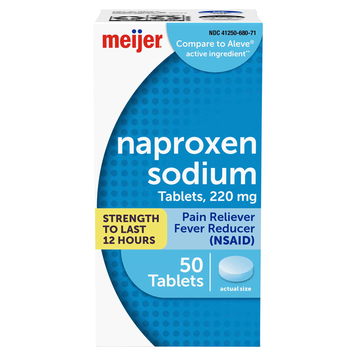 Compare to the active ingredient in Aleve. Meijer Naproxen Sodium Tablets, 220 mg active ingredient is 220 mg of naproxen sodium and may be used as a pain reliever/fever reducer for adults and childreā¦