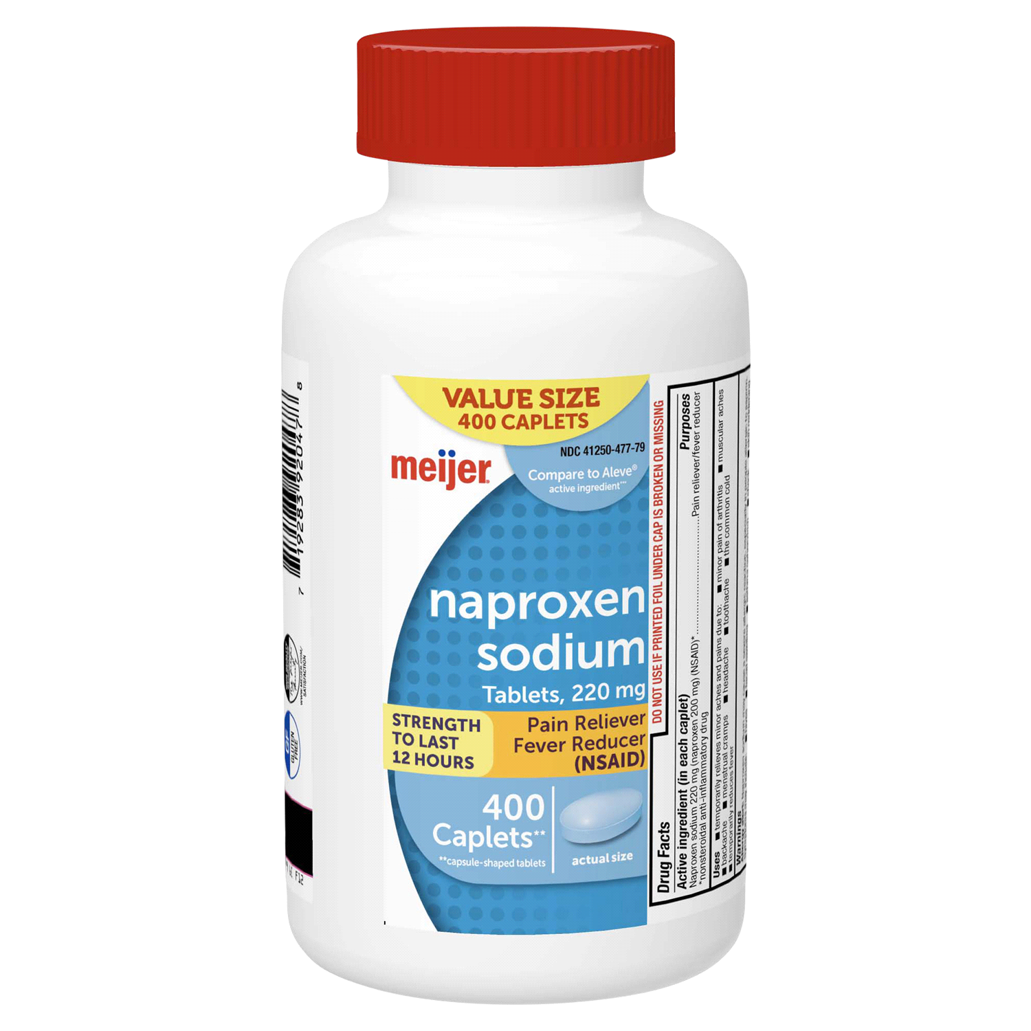 Compare to the active ingredient in Aleve. Meijer Naproxen Sodium Tablets, 220 mg active ingredient is 220 mg of naproxen sodium and may be used as a pain reliever/fever reducer for adults and childreā¦