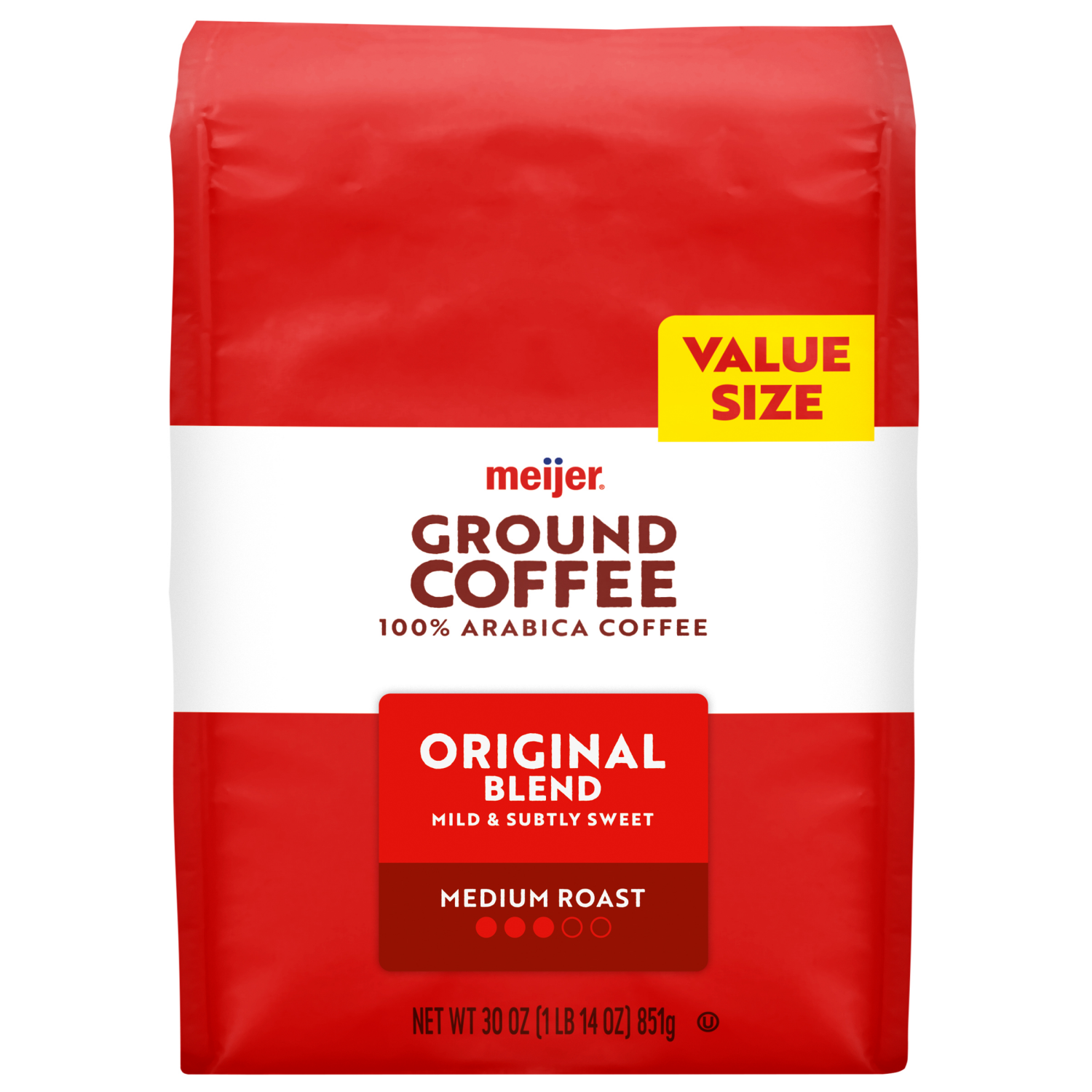 Experience the subtly sweet and mild flavor of Meijer Original Blend Ground Coffee, a perfect blend of 100% Arabica beans. This medium roast coffee, available in a value size, guarantees quality and s…
