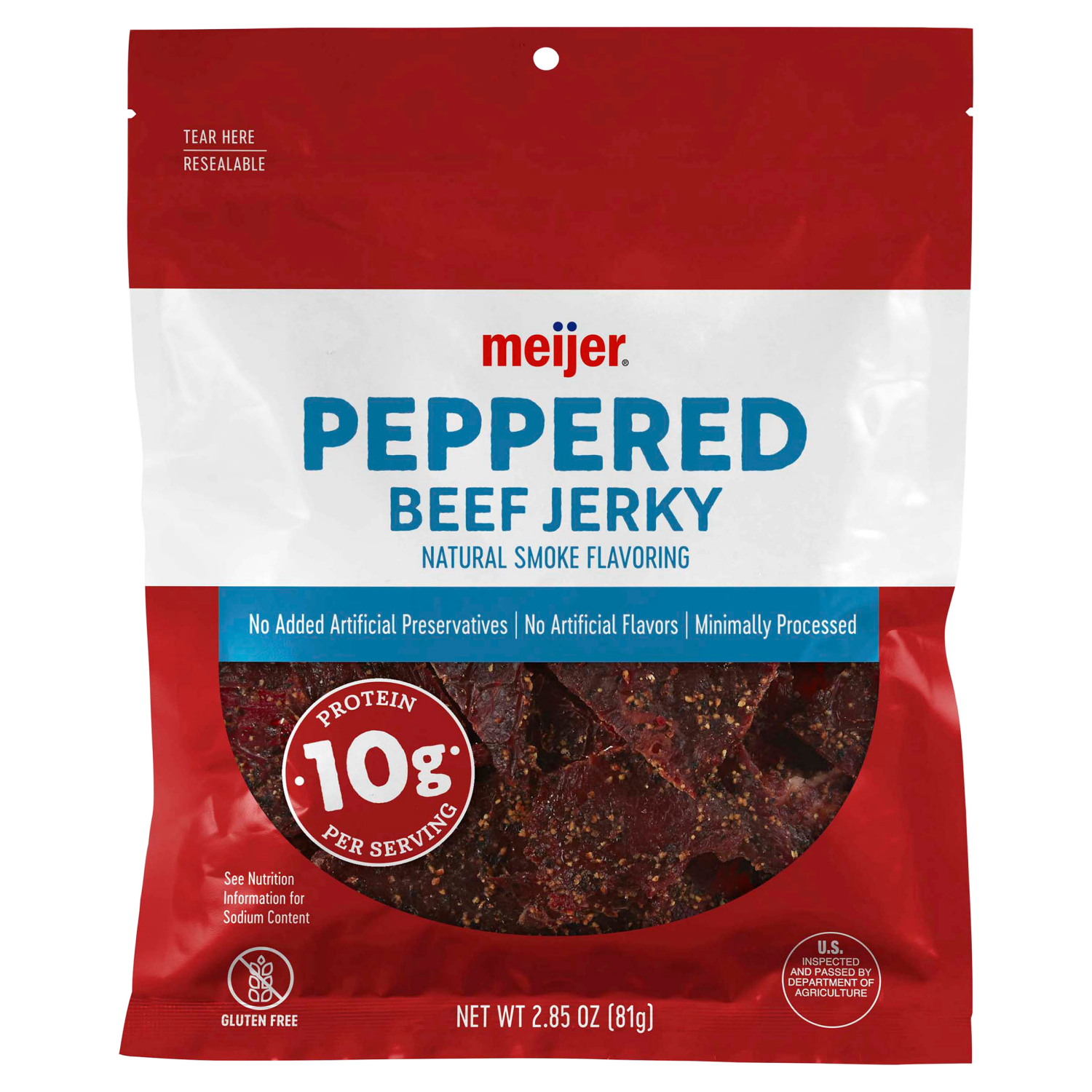 Enjoy a slightly spicy kick and a satisfying chewy texture with every proteinpacked bite of Meijer Peppered Beef Jerky. Take with you on the road, sneak them in your office desk, or snack on them whil…