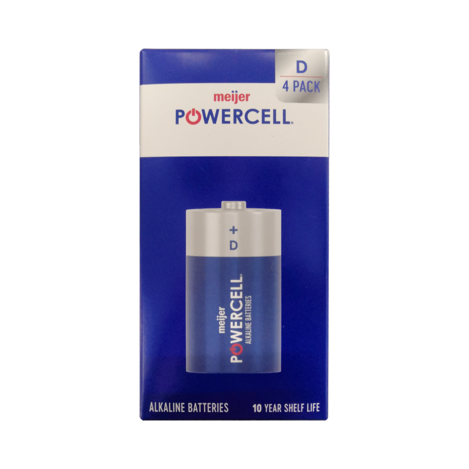 The Meijer Powercell Battery D 4 Pack Paper Box is designed to provide long-lasting power for your everyday devices. These 1.5V alkaline batteries have a remarkable 10-year shelf life, ensuring you al…