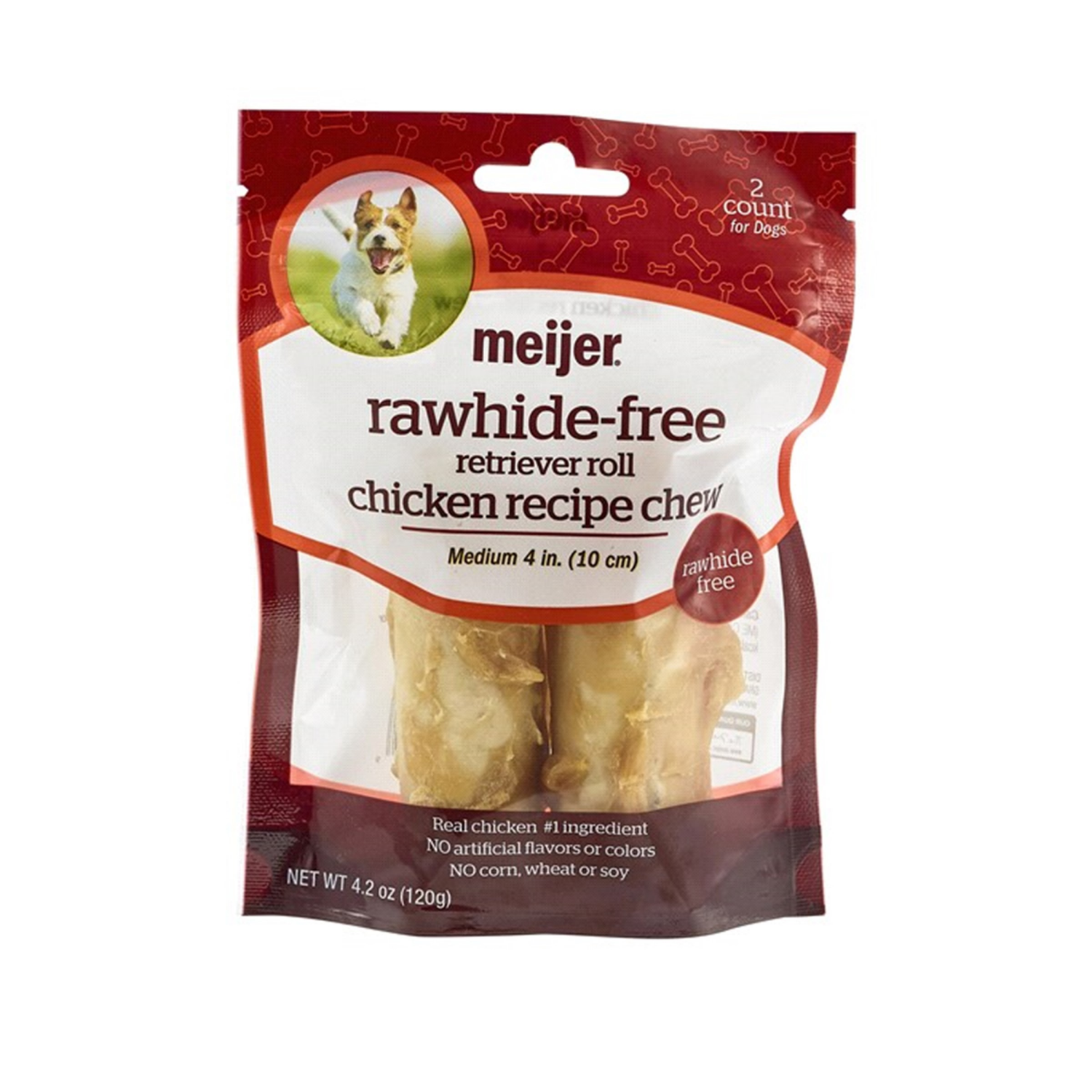 Meijer Rawhide-Free Chicken Recipe Retriever Rolls for Dogs are great tasting and easily digestible. Made with U.S.A. chicken as the first ingredient these chews contain no filler ingredients like cor…