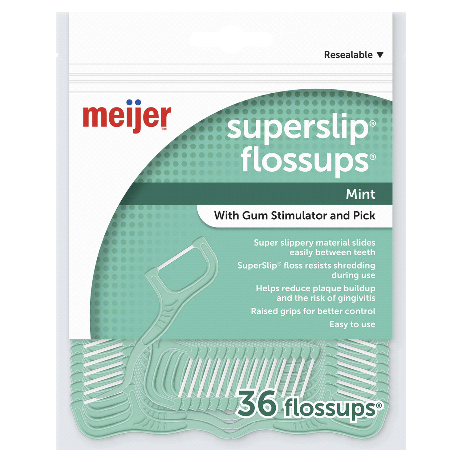 Meijer SuperSlip Flossups have super slippery material that slide smoothly between teeth.Shred-resistant floss helps reduce plaque buildup and the risk of gingivitis.