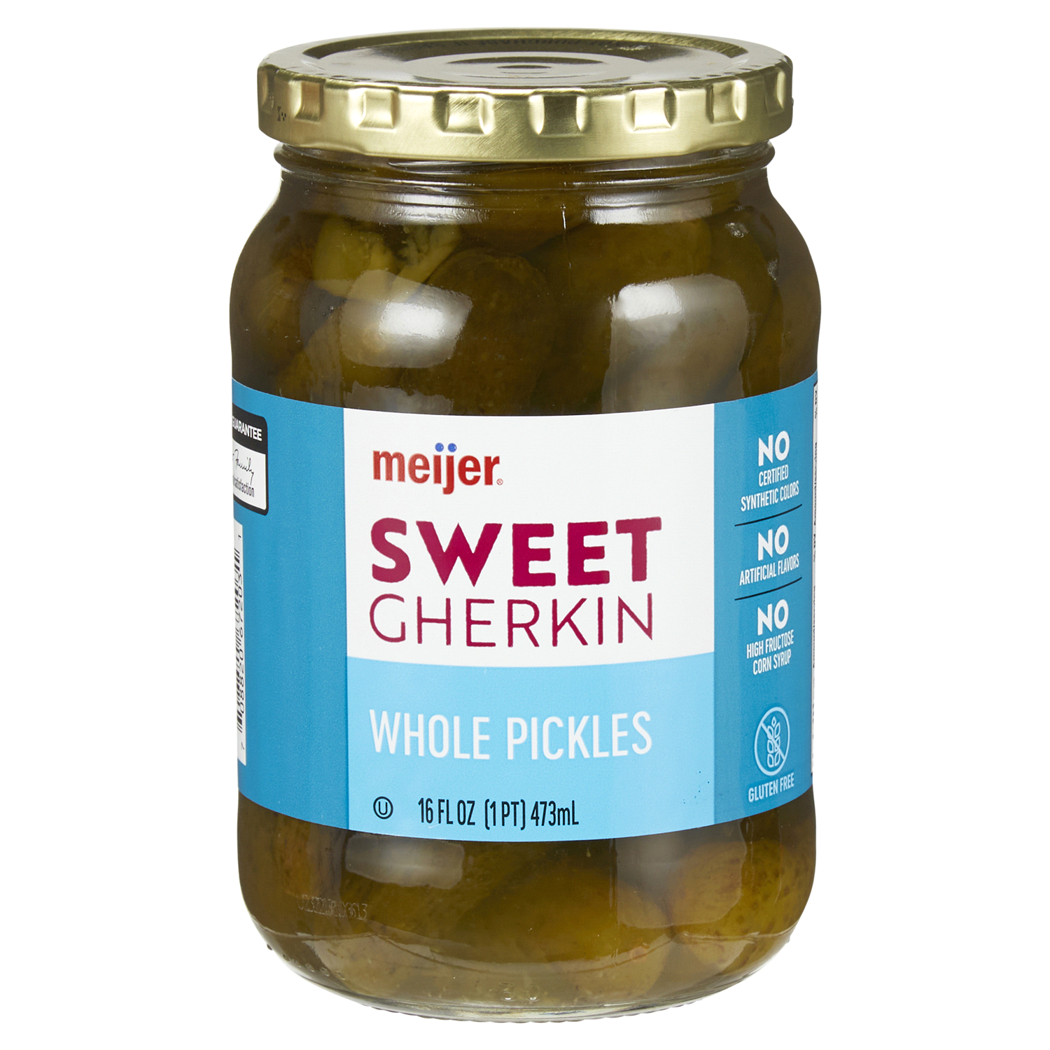 Satisfy your sweetest, tanginess cravings with a single bite of Meijer Sweet Gherkins. Delightfully crisp and refreshing, this fermented cucumber is picked and canned at peak ripeness to ensure freshn…