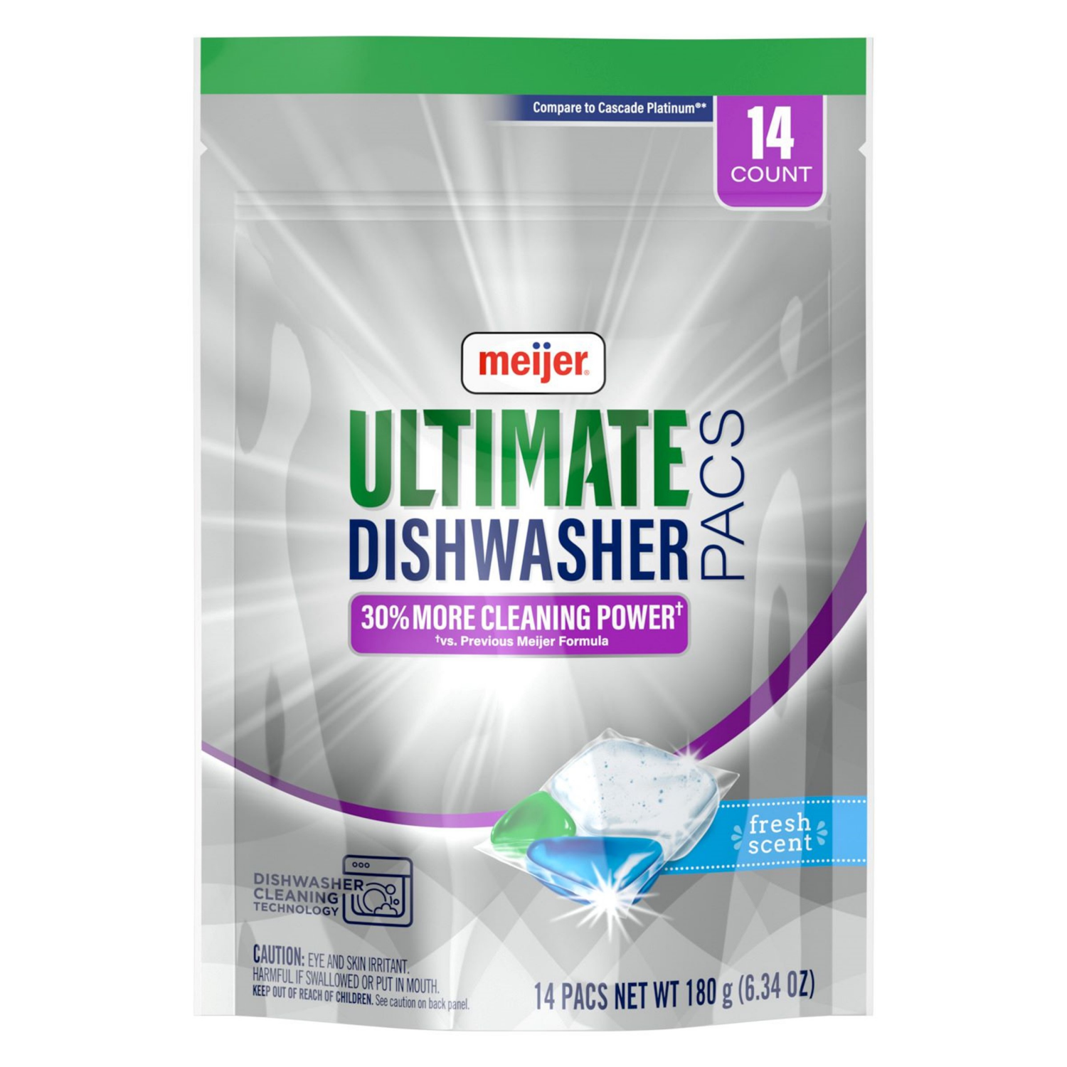 OMeijer Ultimate Dishwasher Pacs power away 24 hour stuck on food and attack burnt on messes. 14 convenient doses keep your dishes virtually spotless, no prewash needed.