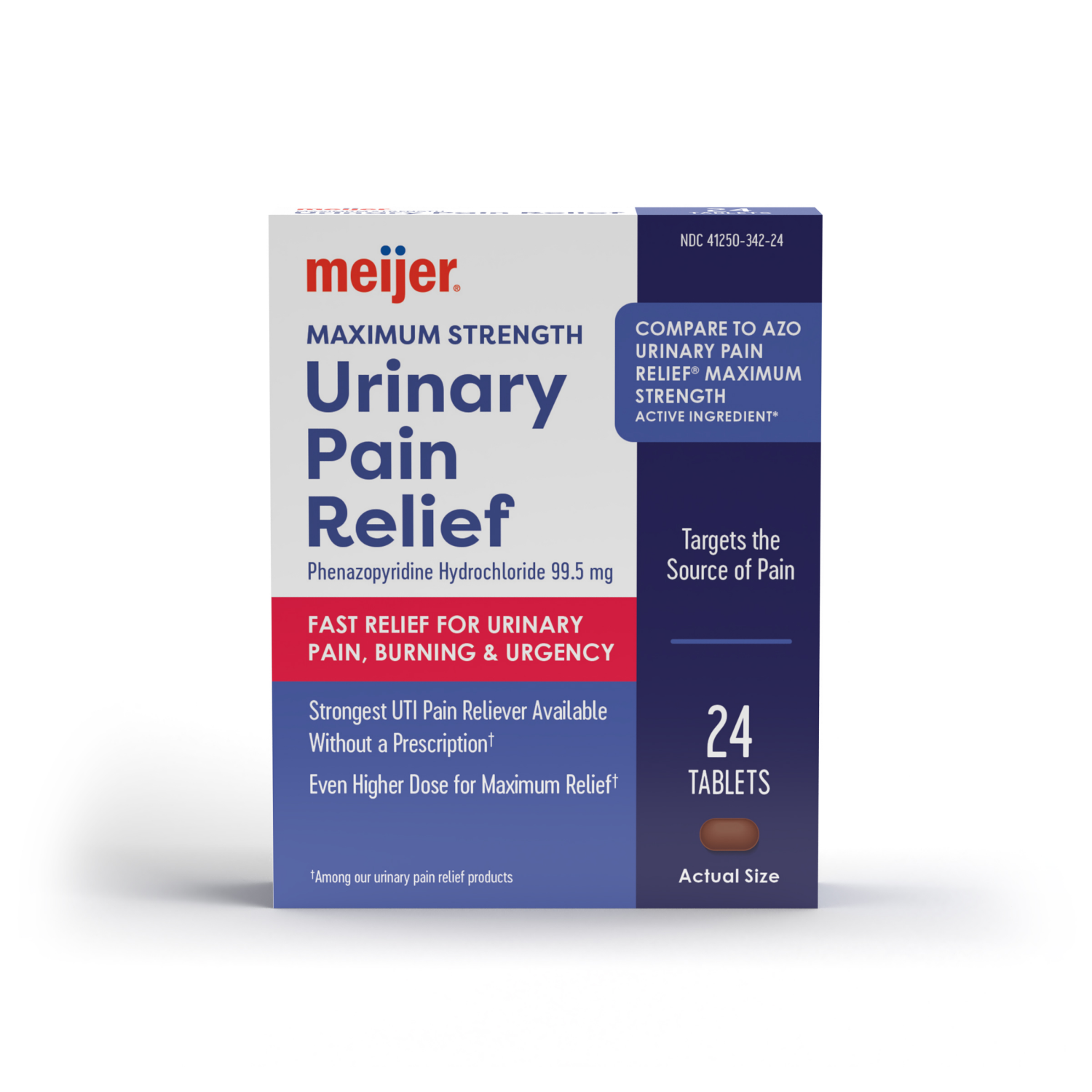 Compare to AZO Urinary Pain Relief Maximum Strength. Meijer Urinary Pain Relief Maximum Strength contains Phenazopyridine Hydrochloride 99.5 mg. It provides fast relief for urinary pain, burning and u…