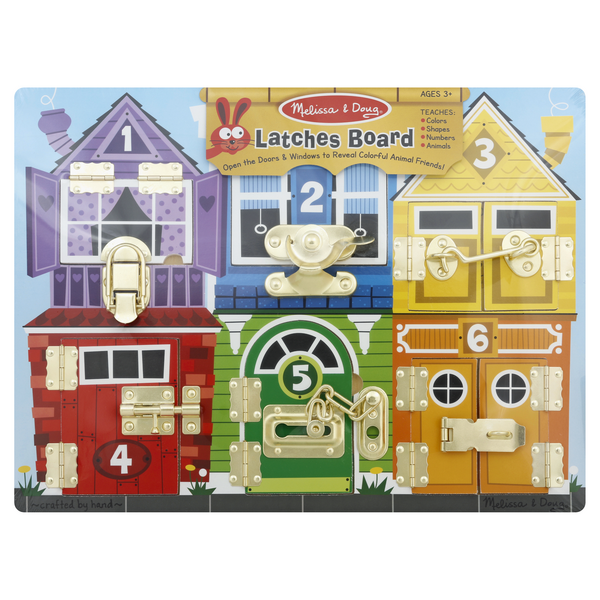 Something about metal latches intrigues kids. Inquisitive minds are engaged fingers coordinate to grasp pull twist turn open shut open shut open shut... Melissa & Doug's Latches Board builds fine moto…