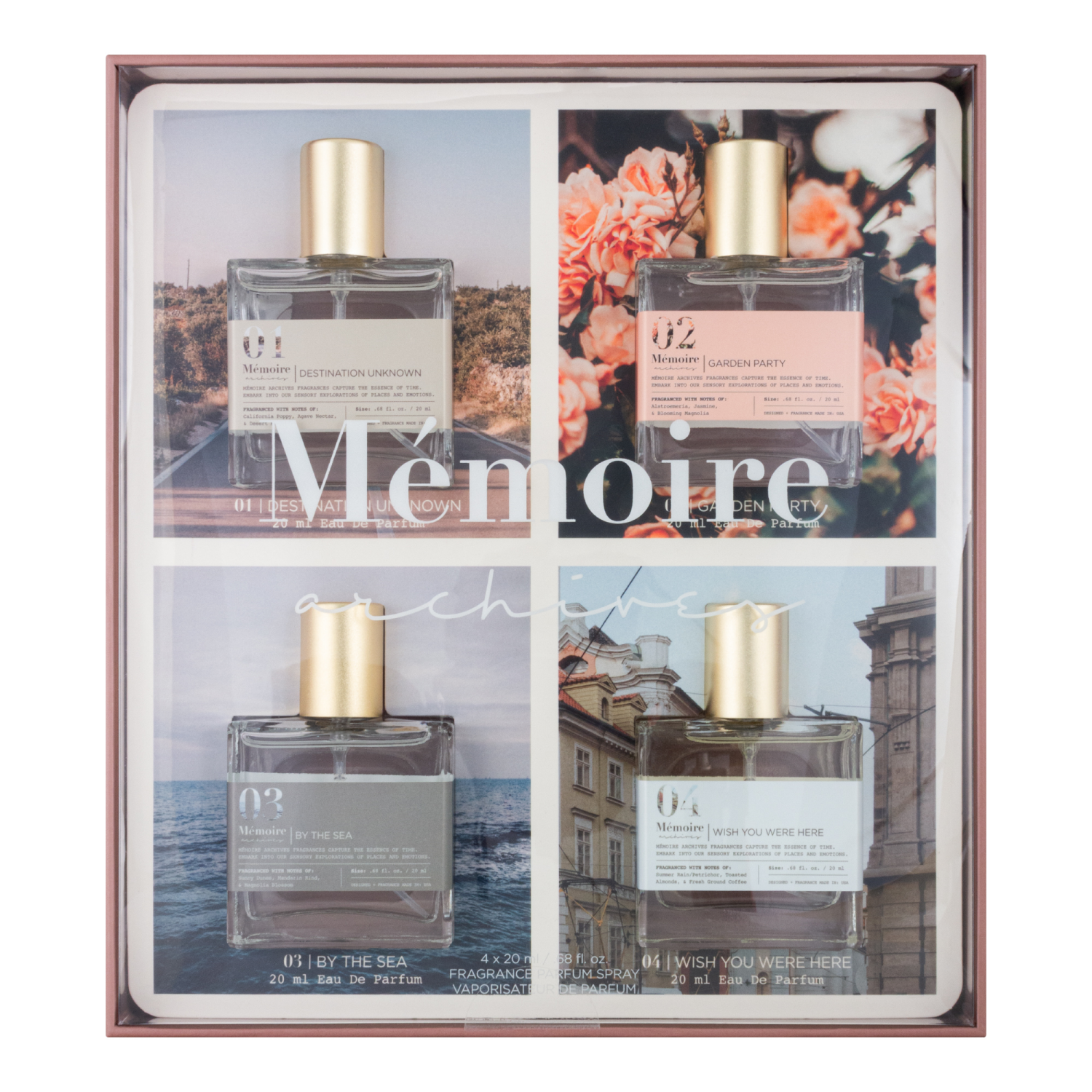 Memoire Archives launches its first coffret featuring best sellers 01-04! Embark into your next adventure with perfect travel sized bottles of Destination Unknown, Garden Party, By The Sea, & Wish You…