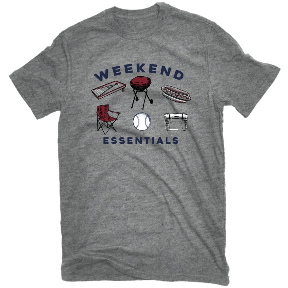 Spring themed mens T-shirt. 140 GSM 60/40 Cotton Polyester Jersey. Front chest Weekend Essentials graphic.