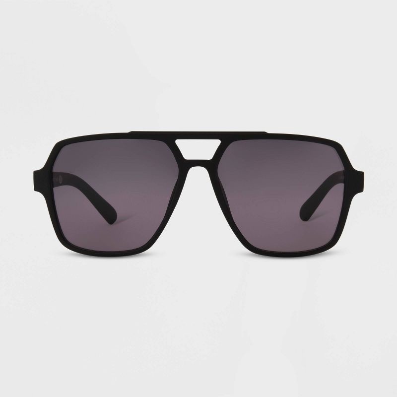 Black rubberized plastic aviator sunglasses with scratch-resistant properties. Feature gray lenses that offer maximum UV protection to keep your eyes shielded from the sun's damaging rays. Hinged temp…