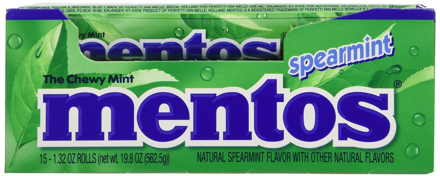 The chewy mint. Natural spearmint flavor with other natural flavors. www.mentos.com. For nutritional information write to Nutritional Data, PO Box 18190, Erlanger, KY 41018.