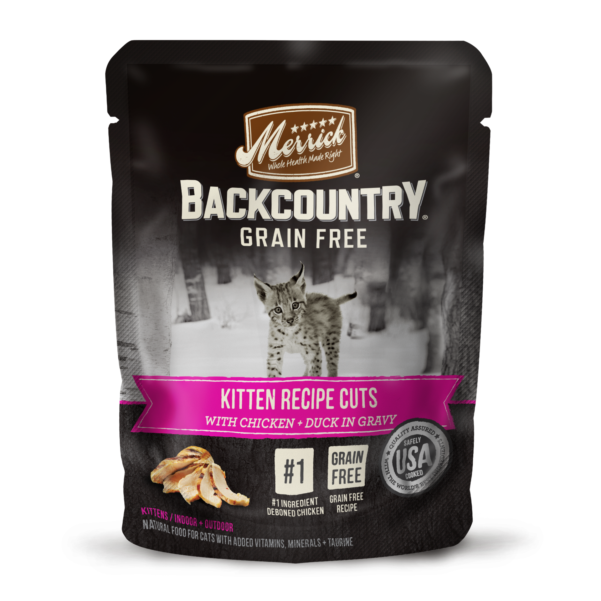 Feed your cat a protein-rich ancestral diet the way nature intended with Merrick Backcountry Grain Free Wet Cat Food Kitten Recipe Cuts in Gravy. Real deboned chicken and duck are always the first ing…