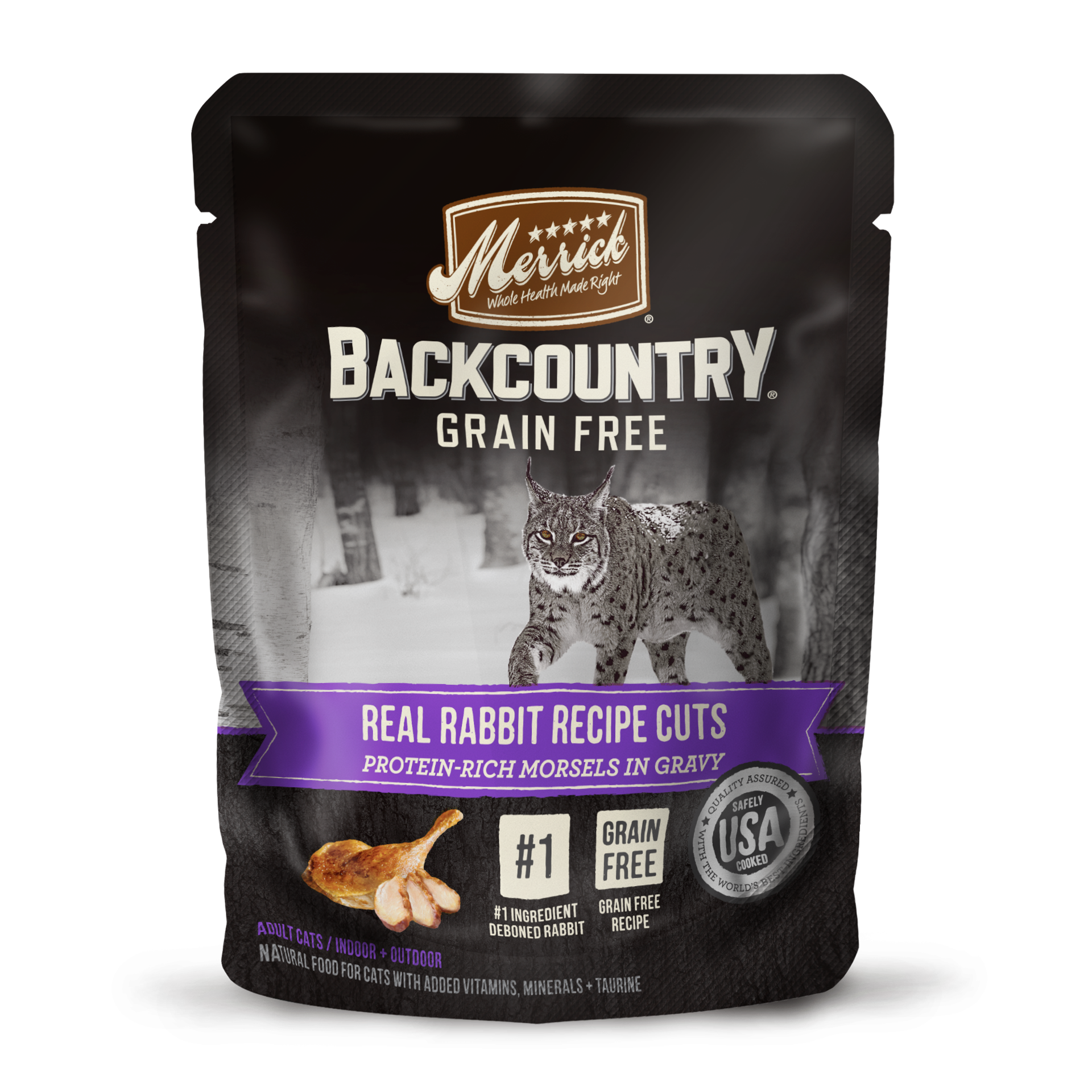 Feed your cat a protein-rich ancestral diet the way nature intended with Merrick Backcountry Grain Free Wet Cat Food Real Rabbit Recipe Cuts in Gravy. Real deboned rabbit is always the first ingredien…