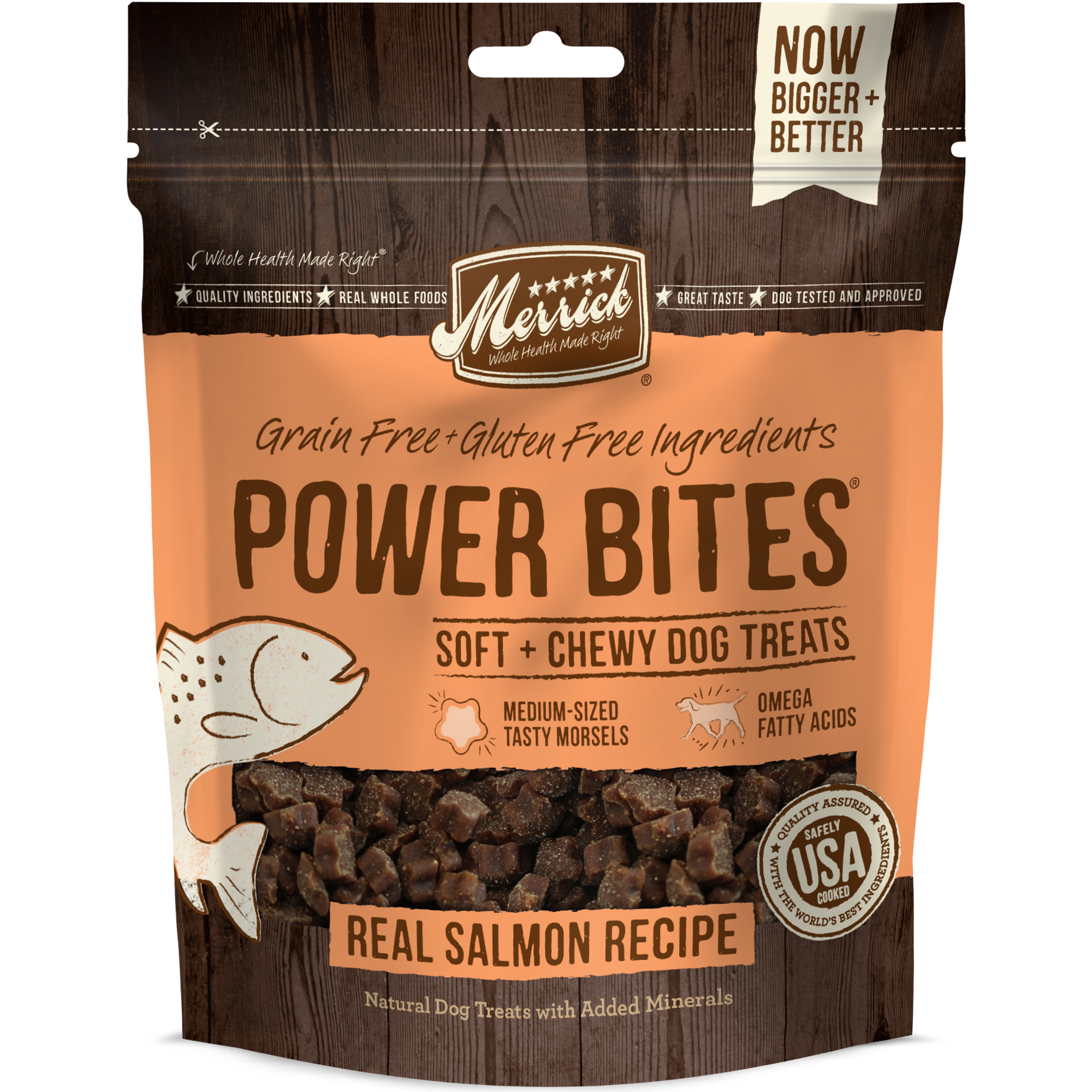 Excite your dog with every bite of Merrick Power Bites Soft Dog treats, Real Salmon Dog Treats Recipe. These real meat dog treats provide real salmon as the first ingredient for soft chewy dog treats.…