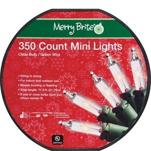 Merry Brite Mini Lights, 360 CT, Clear Bulb / Green Wire String to string. --For indoor and outdoor use. --Steady burning or flashing Total length: 71.5ft. (21.79m). --Connects at both ends. Features …