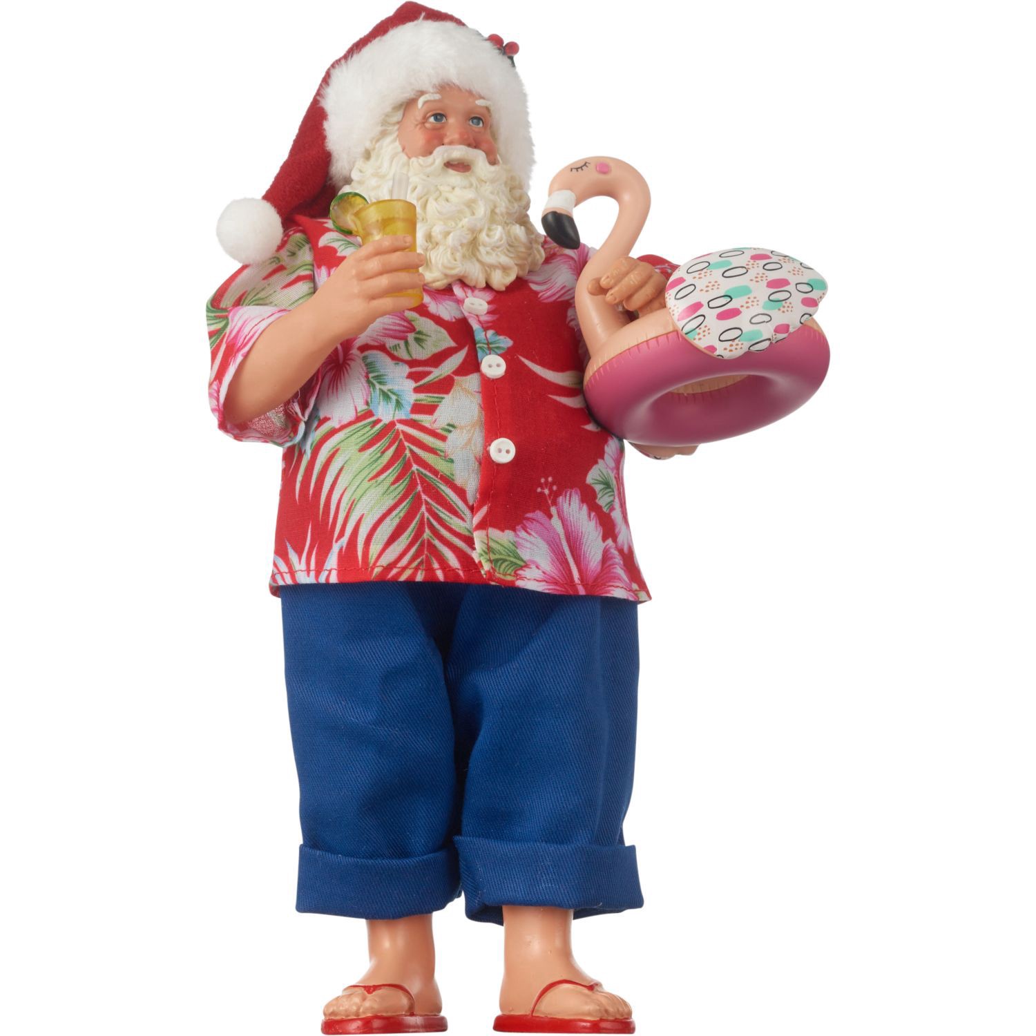 10IN BEACH SANTA Wearing beach vacation clothes and flip-flops White faux fur and hand-painted Santa head Not a toy, for decoration use only
