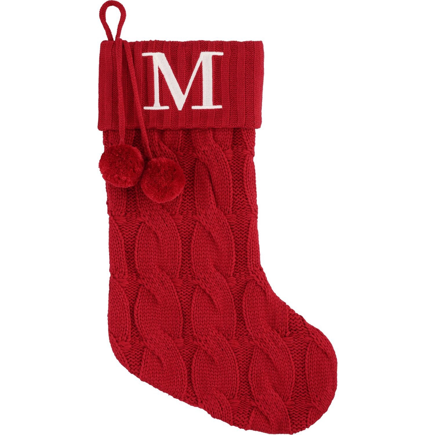 Personalize holiday celebrations with these elegant 21" knitted red color Christmas stockings, each featuring a classic cable-knit pattern, fold-over cuff, playful pom-poms, and a bold embroidered mon…
