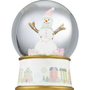 Holiday happiness abounds with this snowman snow globe in pastels and gold accents. Give it a slight shake and watch the iridescent snow dance around.