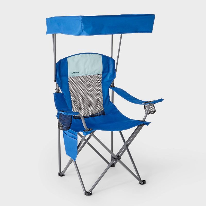 Whether going to the beach or camping, this Canopy Camp Chair from Embark™ will be a perfect fit. Supported by a gray metal frame, this blue camp chair features a collapsible canopy to provide shade o…