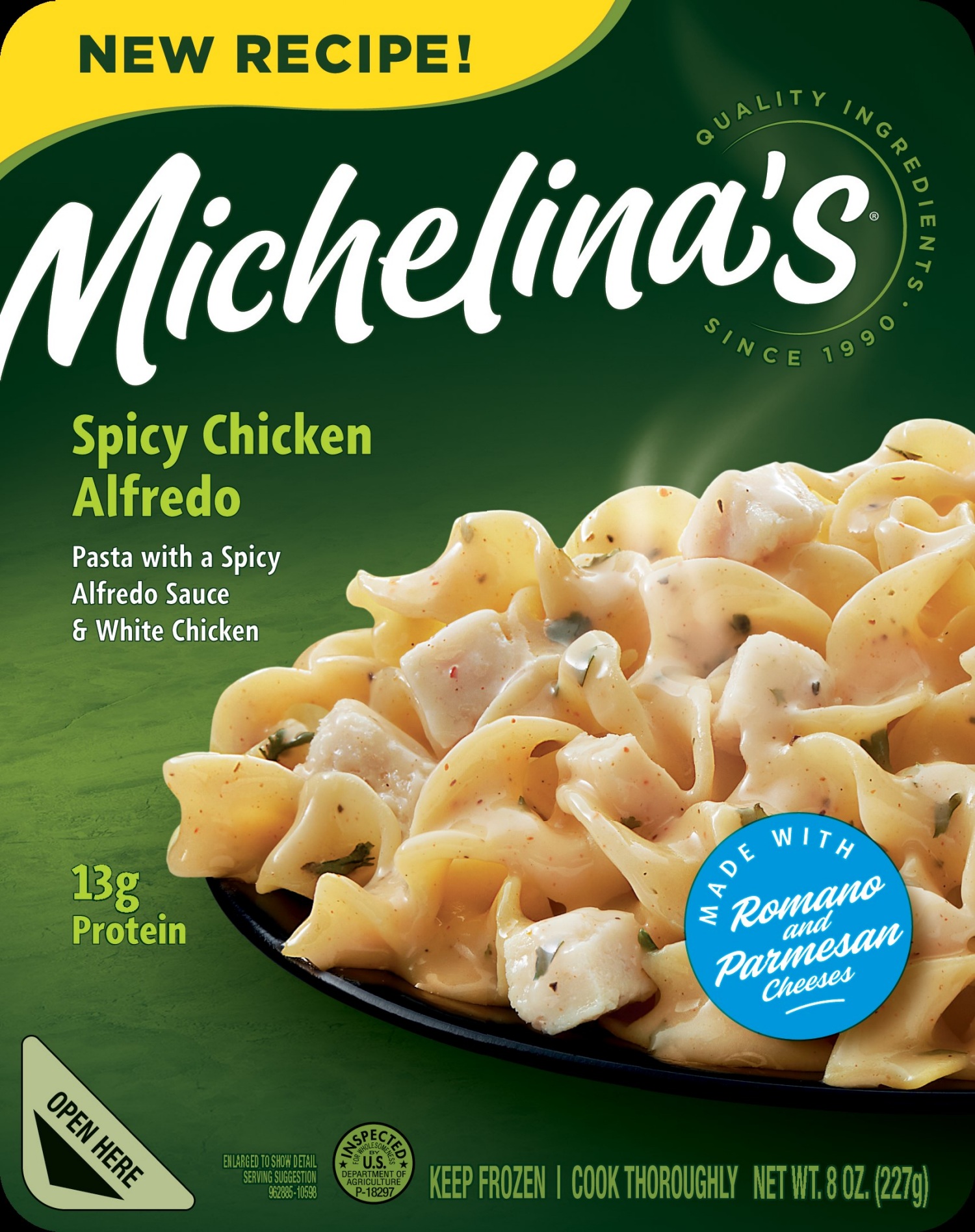 Pasta with a spicy Alfredo sauce & white chicken. 12 g protein. Inspected for wholesomeness by US Department of Agriculture. www.michelinas.com. Facebook. Tell Us We're Doing: 1-800-446-5469 (M-F). Wr…