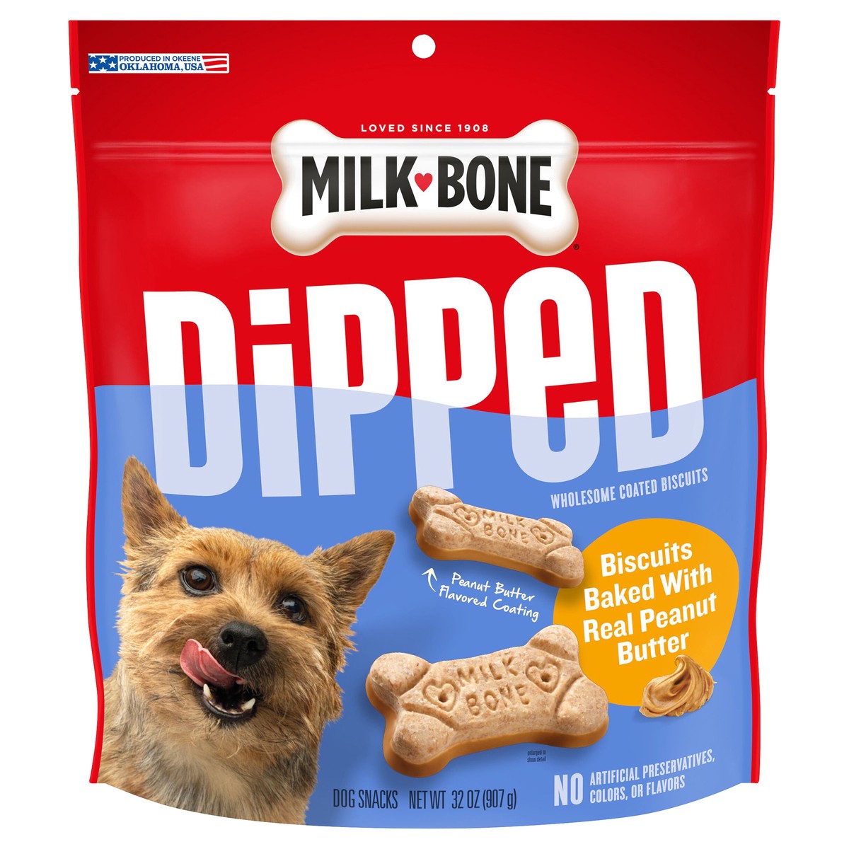 Indulge your dog's taste buds with Milk-Bone Dipped Dog Biscuits Baked With Real Peanut Butter, produced in Okeene, Oklahoma USA. These dog biscuits are baked with a real peanut butter to give your do…