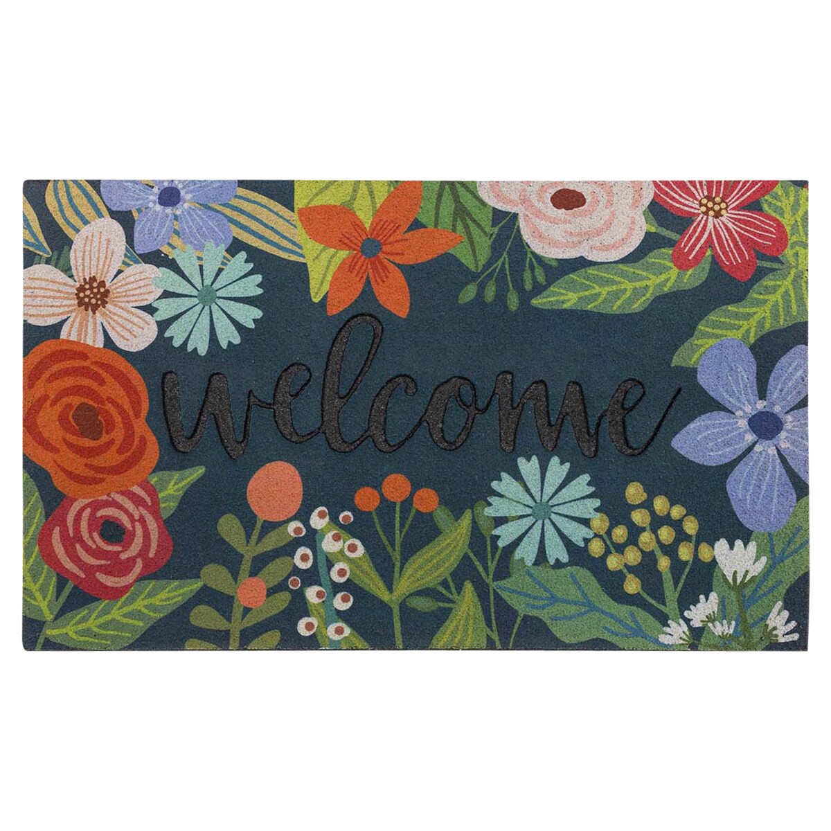 Beautiful botanical blossoms in blue, red, pink, purple and green greet guests over a navy background in the floral style of Mohawk Homes Spring Sunset Welcome Doormat, size 18 X 30. Ideal for any por…