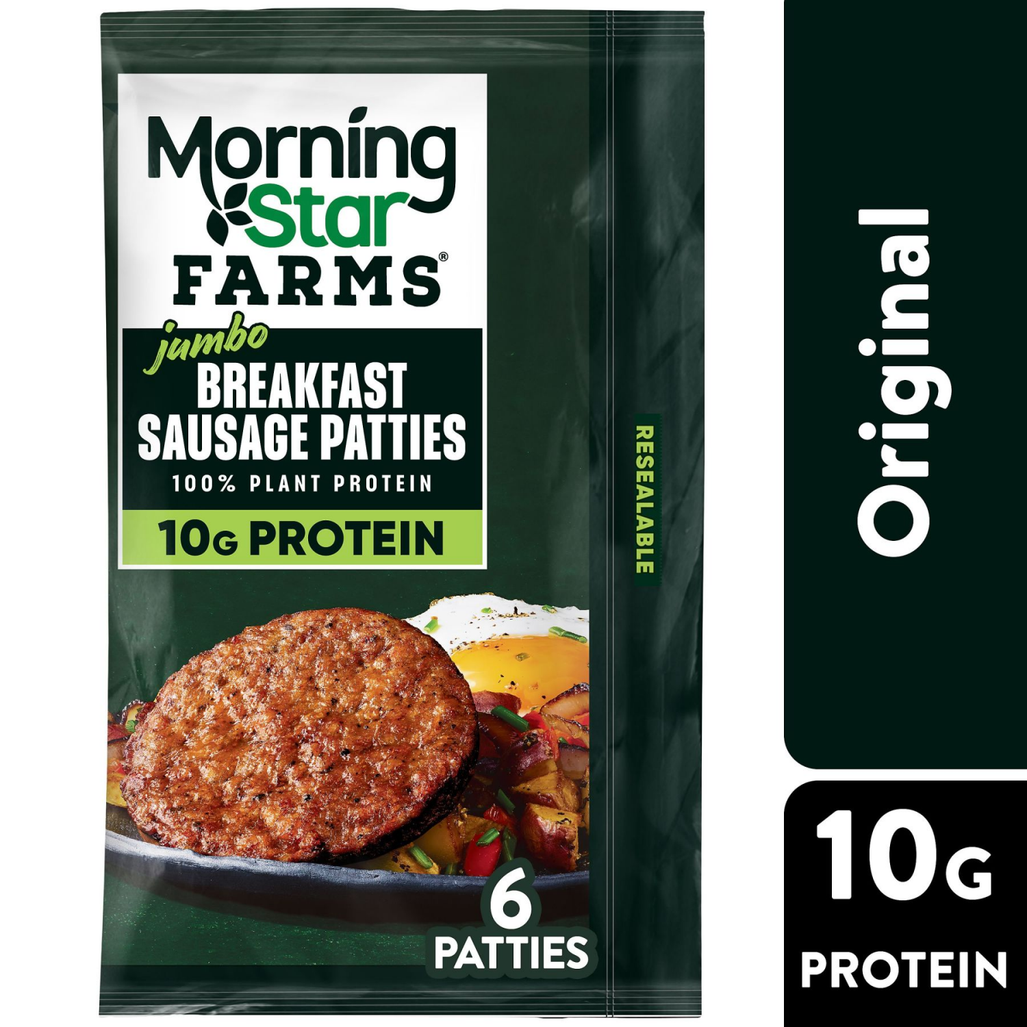 A delicious meat alternative to any balanced breakfast, MorningStar Farms Original jumbo sausage patties are plant-based and seasoned with an inviting blend of aromatic herbs and spices. This convenie…