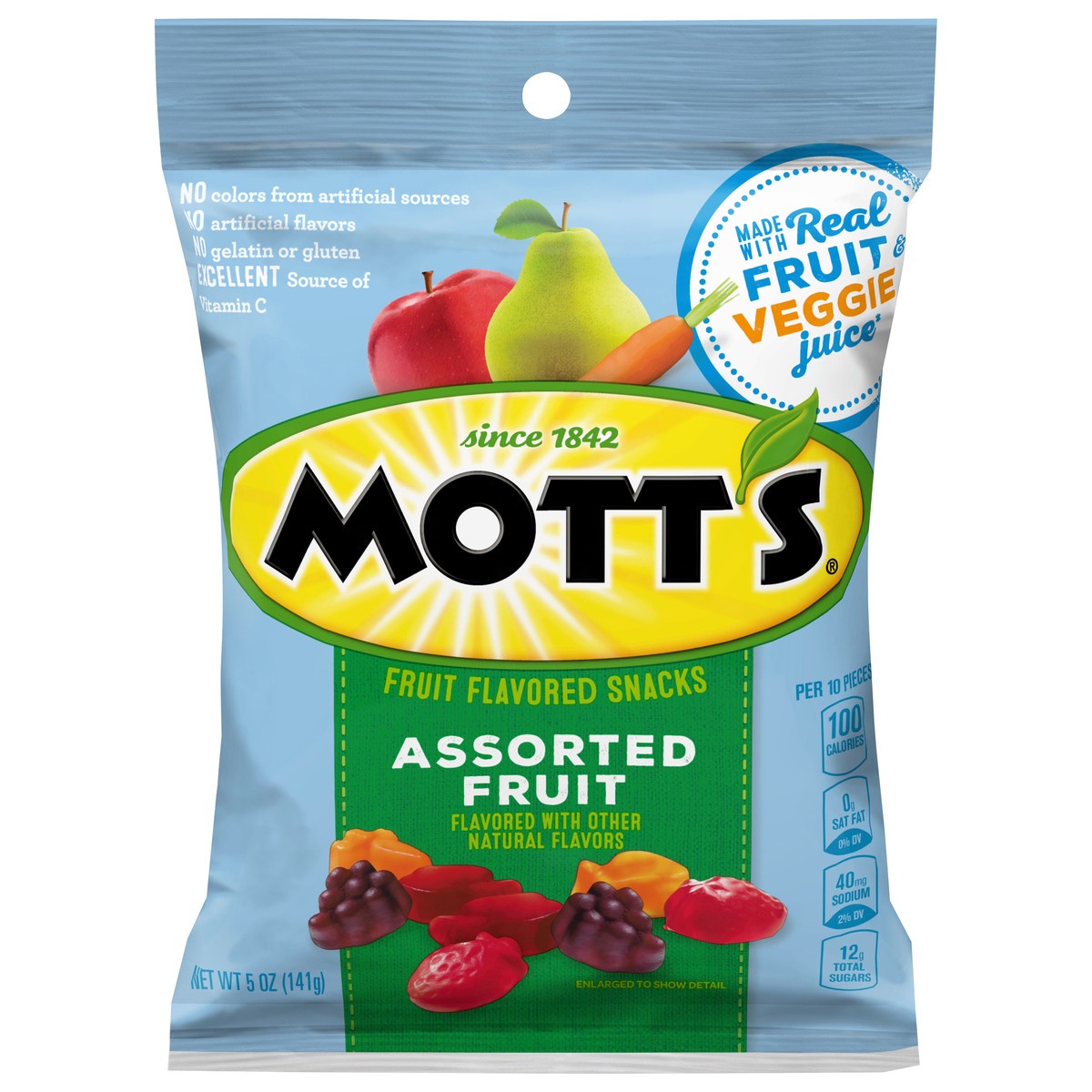 Mott's Assorted Fruit Flavored Snacks are made with real fruit and veggie juice, and have 70% of your daily vitamin C. They contain no gelatin, gluten, artificial flavors or colors.