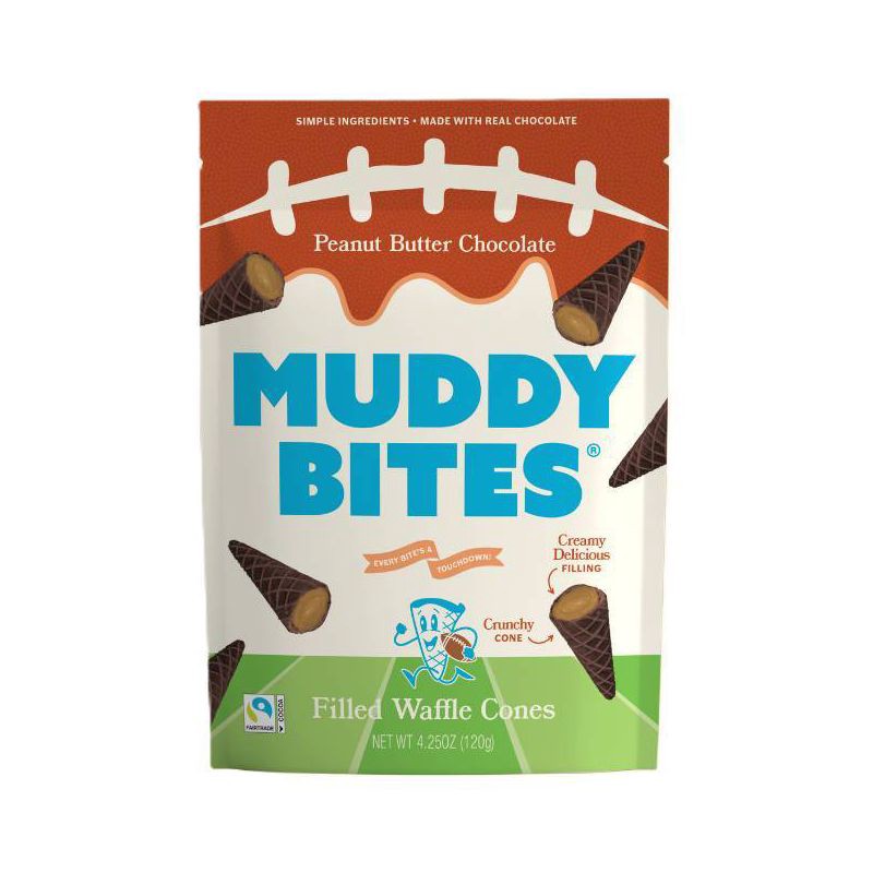 Game day just got better! Crunch into Muddy Bites Peanut Butter Chocolate Filled Waffle Cones: the ultimate winning combo makes every snack time a win! Each crunchy mini cone is packed with smooth pea…