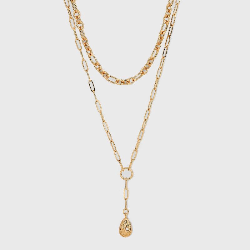 Stun everyone by accessorizing with the Multi-Strand Pearl Pendant Necklace from A New Day. This multi-strand necklace feature two layers of linked chains — the longer one adorned with a teardrop pend…