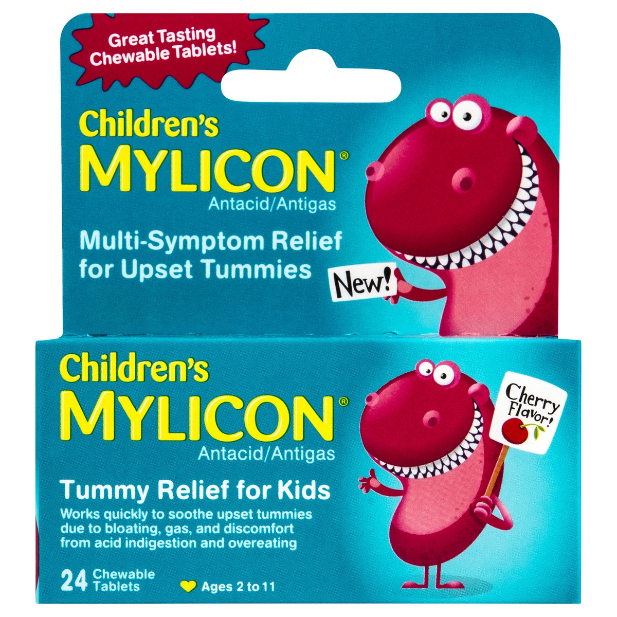 Introducing NEW Children s MyliconTummy Relief for Kids, the only multi-symptom, chewable tablet for kids 211. Designed to quickly soothe upset tummies due to bloating and discomfort from gas, acid, i…
