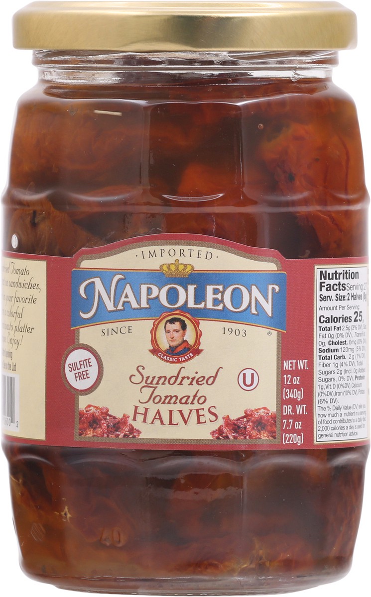 Imported. Since 1903. Classic taste. Sulfite free. Napoleon Sundried Tomato Halves are perfect on sandwiches, pizza, pasta and in your favorite salad. They are a colorful addition to any antipasto pla…