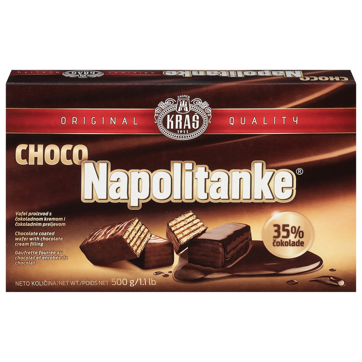 Original quality. Food safe. Wafer Filled with chocolate cream (47%), coated with chocolate (35%). Dispose of properly.