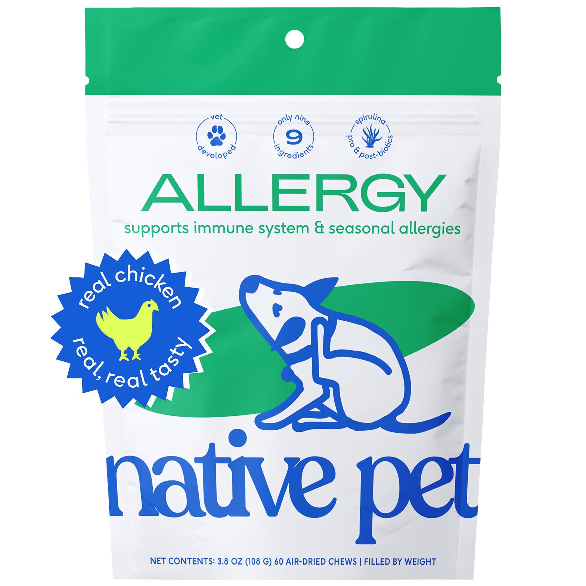 No-nonsense supplements. With 60 air-dried chews with chicken approx (product filled by weight). Made with 9 ingredients including spirulina, colostrum, probiotics, and postbiotics. Spirulina: Superfo…