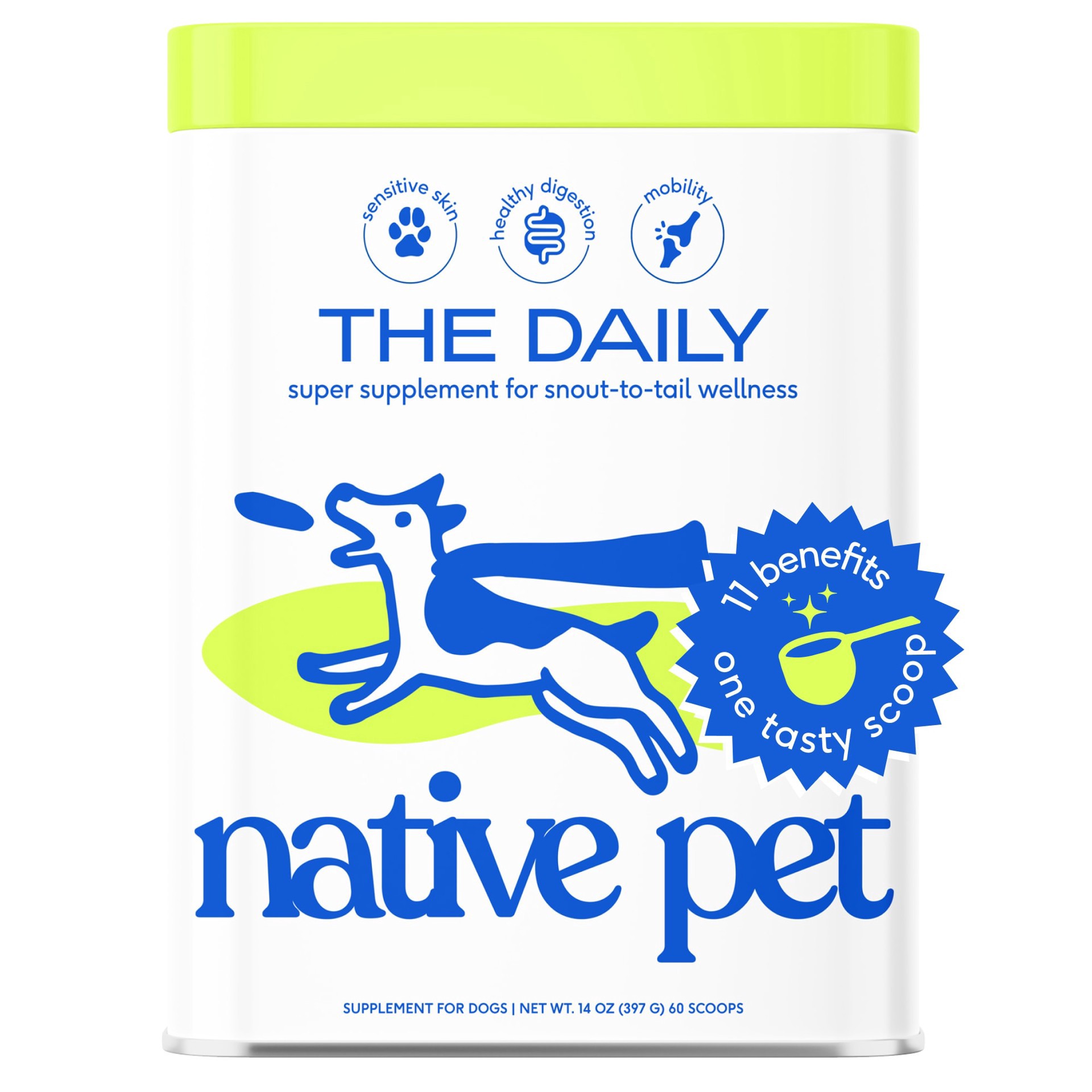 Native Pet's The Daily: an everyday super supplement for dogs! Our all-in-one powder provides eleven essential benefits that tackle the most common ailments of our pets including: mobility, energy, gu…