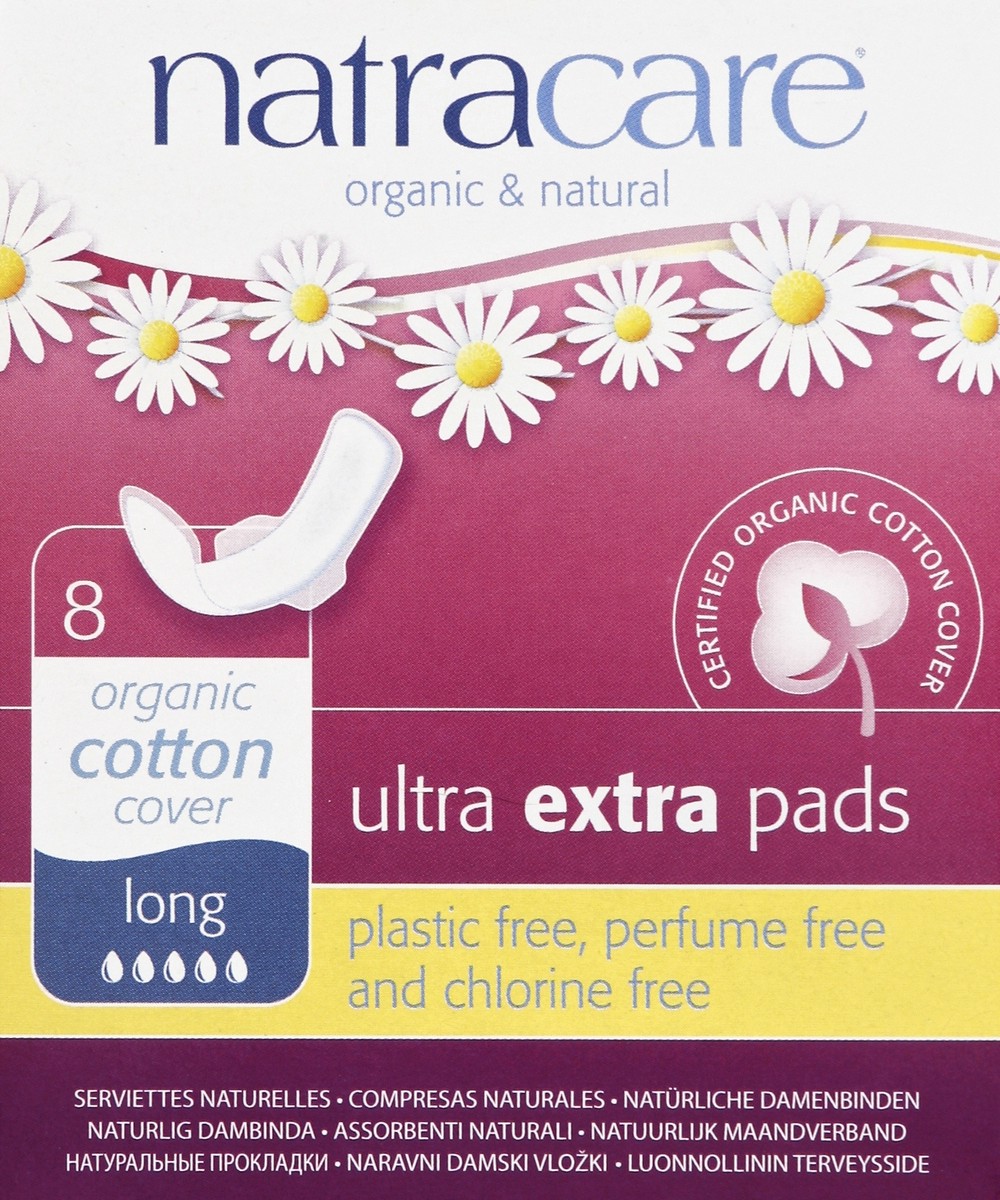 Pad: Organic Cotton, Cellulose from Wood Pulp, Corn Starch. Packaging: Wrapper: Starch; Carton: Recycled Cardboard.
