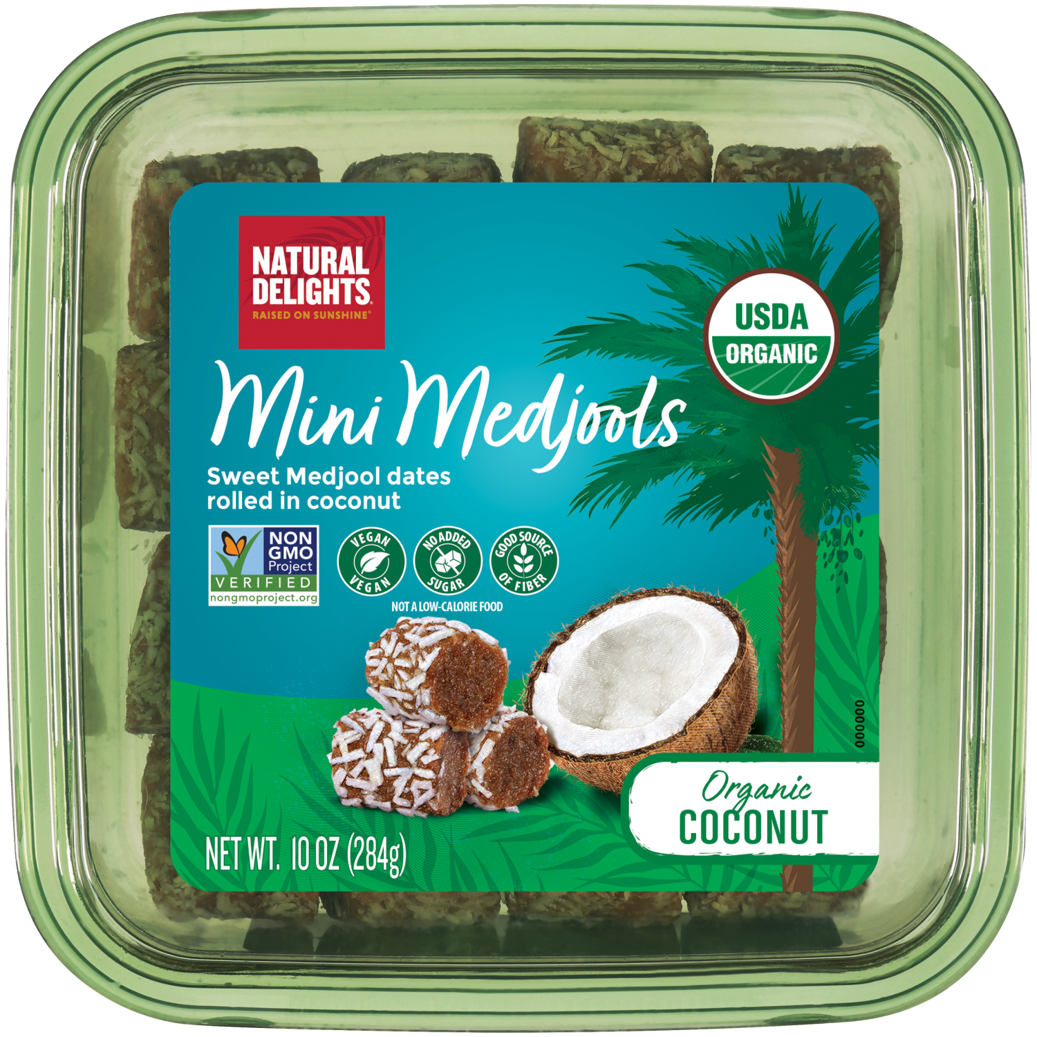 Stock your pantry with 10 oz tubs of Natural Delights Organic Coconut Mini Medjools. Two ingredients, sweet caramel-like Organic Medjool dates and organic shredded coconut. Natural Delights Organic Co…