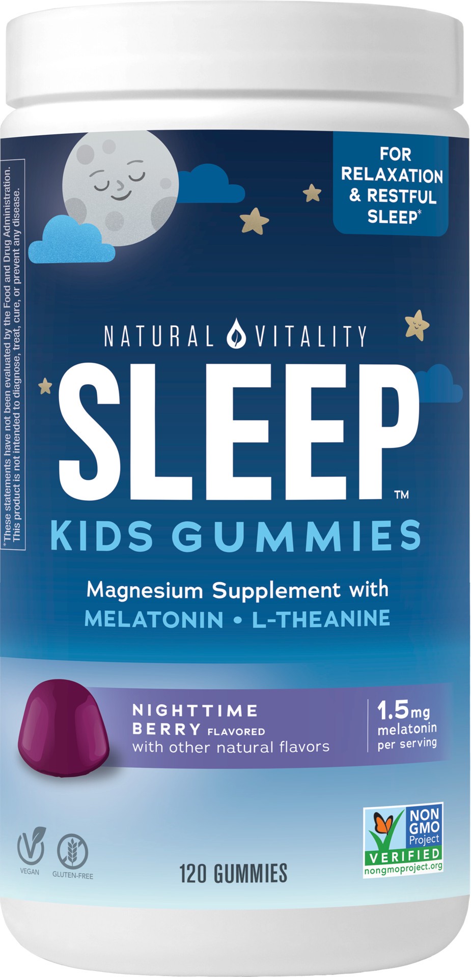 Natural Vitality SLEEP Kids Gummies are a magnesium supplement with L-theanine and melatonin to help your kids get a relaxing and restful night's sleep and help your child's muscles relax before bed (…