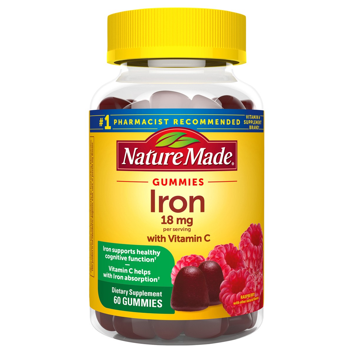 Nature Made Iron 18 mg per serving with Vitamin C Gummies are dietary supplements that are vital for red blood cell formation. This Iron supplement also supports healthy cognitive function. This gluteā¦